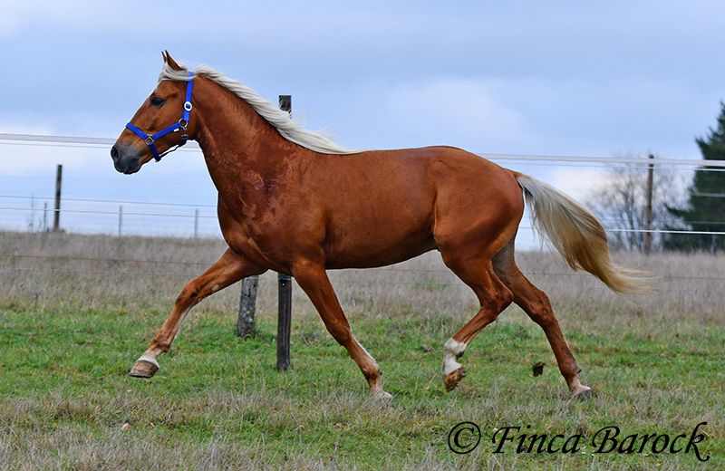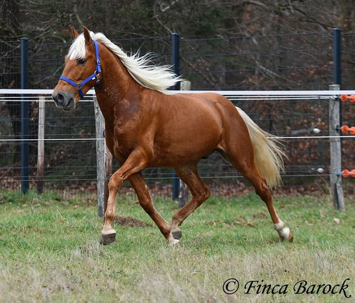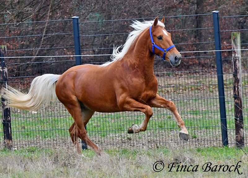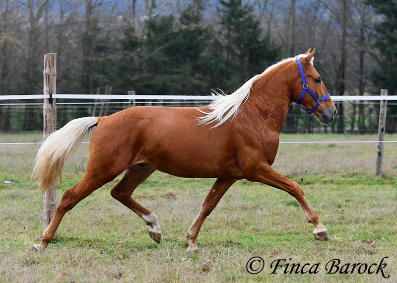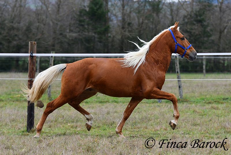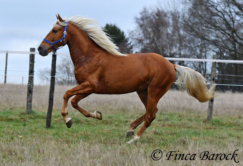 Race : Andalusian Nom : Yucatan Sexe : Hongre Taille : 1,56 m Naissance : 01.02.2020 Couleur : Palomino Prix : 9 900 € Père : non connu Mère : non connue Yucatan, Notre petit cheval compact et amical, avec une robe dorée. En main, il est câlin, vif et se réjouit de passer du temps avec son humain. Yucatan a été beaucoup monté en extérieur et s’y sent parfaitement à l’aise. Il connaît aussi bien la promenade seul qu’en groupe. Il possède un trot magnifique, ample et expressif, et il peut suivre le rythme de chevaux plus grands sans problème. Il est habitué au trafic routier, aux chiens et aux cyclistes. Il accepte également bien les jeunes chevaux et les dépasse calmement face à des objets inconnus. En carrière, il connaît les bases et nous continuons à le faire progresser. Yucatan préfère un cavalier qui ne pousse pas trop. Lorsqu’on lui met trop de pression, il s’arrête. Avec des aides normales, il avance volontiers. Il est confortable en selle et travaille avec plaisir. Sa galop en montée est également remarquable. En plus du saut, Yucatan aime le travail à la longe. Il prend aussi plaisir à faire des exercices circassiens et montre une grande envie d’apprendre. Il a appris à s’allonger en peu de temps. Nous avons également commencé à lui travailler le pas espagnol. Un cheval exceptionnel, avec beaucoup de charisme et un caractère fantastique, qui se montre très polyvalent et enthousiaste face à de nouveaux défis. Inclut un examen vétérinaire clinique et des radiographies. Contact : Finca Barock, tél. 0173-696 31 81, 56291 Wiebelsheim