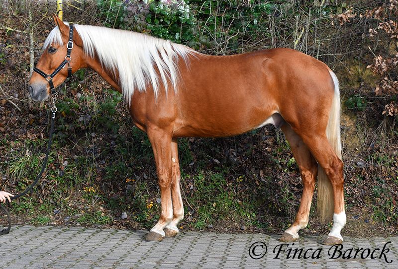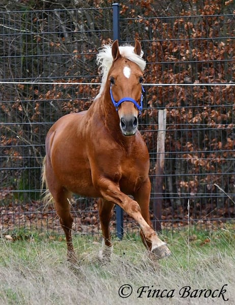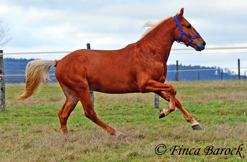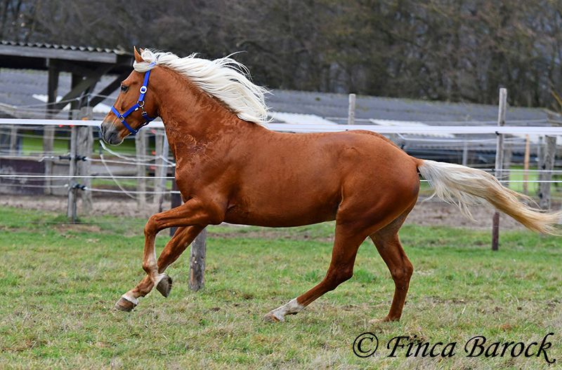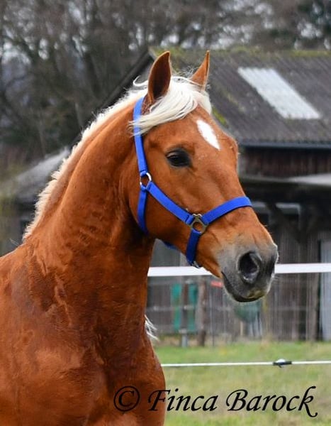 Rasse: Andalusier Name: Yucatan Geschlecht: Wallach Stockmaß: 156 cm Alter: 01.02.2020 Farbe: Palomino Preis: 9900 € Vater: o. P. Mutter: o. P. Yucatan, unser kompakter, freundlicher Bub in blonder Jacke. Im Umgang ist er verschmust, aufgeweckt und freut sich darüber mit seinem Menschen Zeit zu verbringen. Yucatan ist bis jetzt viel im Gelände geritten worden und fühlt sich hier total wohl. Er kennt es sowohl alleine als auch in Gruppen durch die Gegend zu streifen. Yucatan hat einen tollen, raumgreifenden Schritt und hält auch mit größeren Pferden gut mit. Straßenverkehr, Hunde und Fahrradfahrer sind ihm bekannt. Auch jüngere Pferde „nimmt er gut mit“ und schleppt diese an Unbekannten Sachen vorbei. Im Viereck kennt er die Bacic und wird hier von uns weiter gefördert. Yucatan wünscht sich einen Reiter der nicht zu viel treibt. Bei zu viel Druck bleibt er stehen. Bei normalen Hilfen geht er fleißig vorwärts. Er ist sitzbequem und arbeitet gerne mit. Auch seine Bergaufgaloppade ist hervorzuheben. Neben dem Reiten liebt Yucatan das freiarbeiten. Auch circensiche Lektionen machen ihm Spaß und hier zeigt er sich ebenfalls sehr lernbereit. So hat erinnerhalb kürzester Zeit das liegen erlernt. Spanischen Schritt haben wir ebenfalls angefangen. Ein toller Bub mit viel Ausstrahlung und klasse Charakter der sich sehr vielseitig zeigt und auf neue Aufgaben freut. inkl. klinischer tierärztlicher Untersuchung und Röntgenbildern Kontakt: Finca Barock, Tel. 0173-696 31 81, 56291 Wiebelsheim