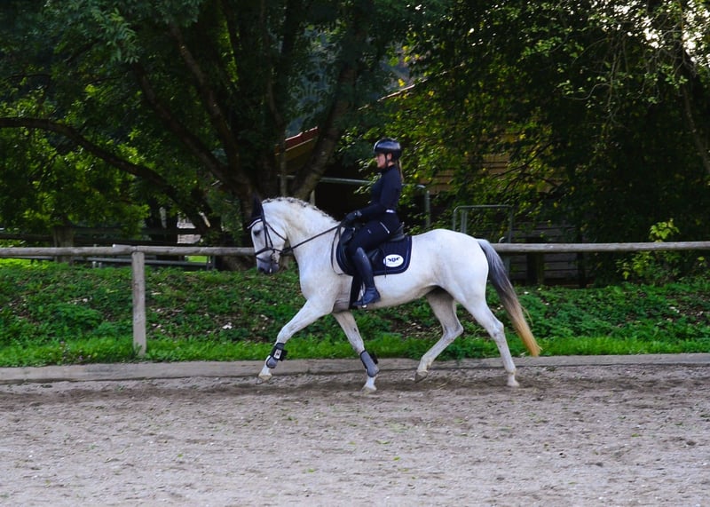 Paquita presents herself as a 13-year-old gray mare, expressive and with three excellent basic gaits. She is light in the poll, very well ridden, and has an absolutely lovable character. She is also a true treasure in handling. She is familiar with the indoor arena, outdoor arena, and trail rides. She is also recommended for Working Equitation.