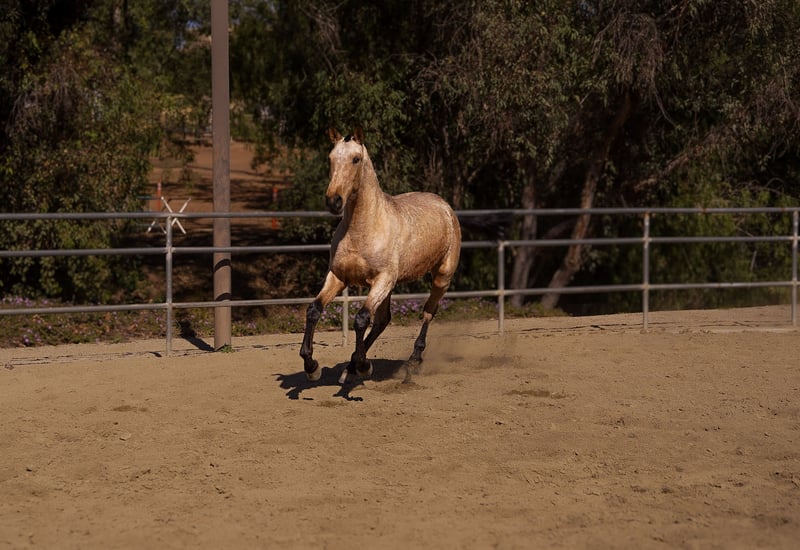 2-year-old buckskin filly is bred from outstanding Spanish lines. Her dam, La Mesera RA (ANCCE registered), descends from notable sires such as Grano de Oro JP and Firme Arm II, known for passing on strength, movement, and beauty. The mare’s pedigree traces back to AG Palomo and Diludido El Bayo, blending proven quality and athletic ability. Her sire was a black stallion, Unfortunately, a breeding certificate was not obtained, so she will be sold without papers—but her pedigree influence is evident in her type, structure, and natural carriage. She shows a correct build, expressive movement, and a willing, kind nature—making her a versatile prospect for sport, pleasure, or future breeding for those who value Spanish quality without the price tag of paperwork.