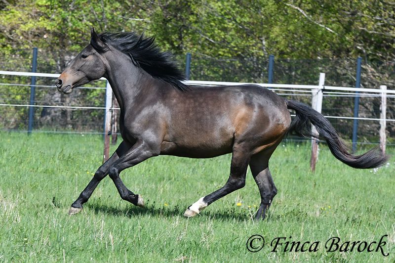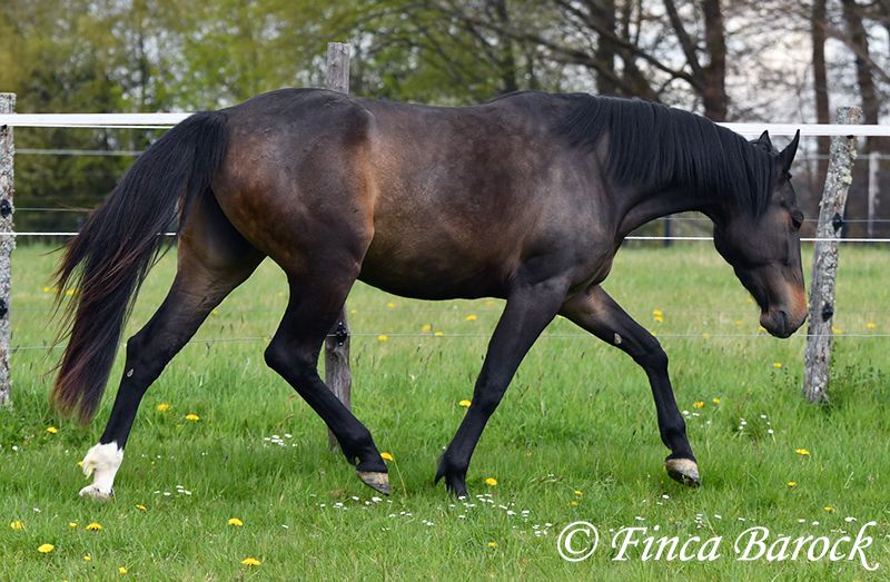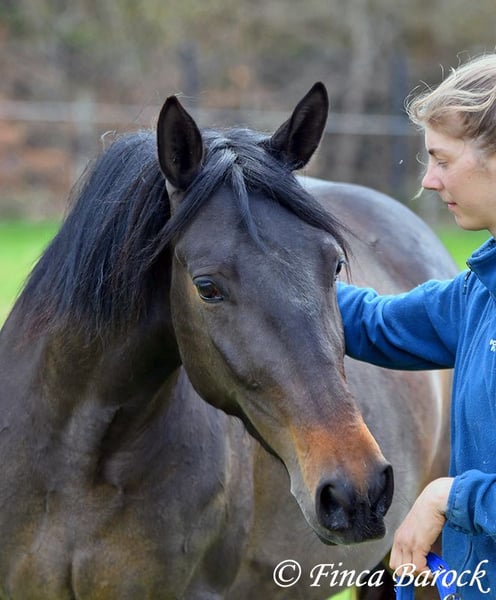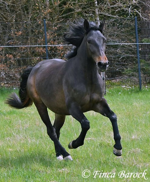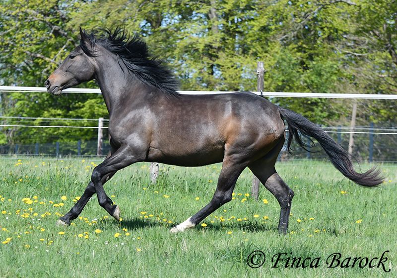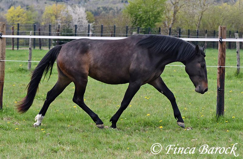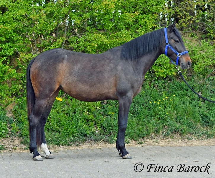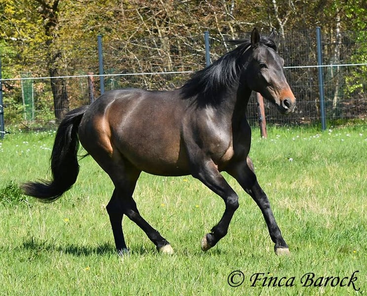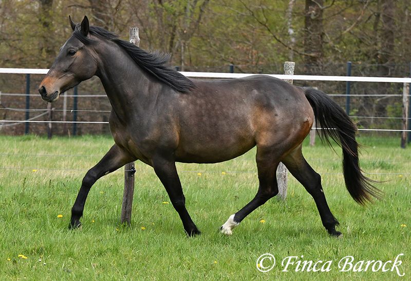 Breed: Andalusian Name: Africana Gender: Mare Height: 15.6 hh (156 cm) Date of Birth: April 17, 2022 Color: Black-brown Price: €9,500 Sire: Unknown Dam: Unknown Africana, Our gentle, very affectionate mare with an excellent temperament. There are simply horses like this—youngsters who possess an incredible innate calmness. Africana definitely belongs to this group. She will only turn four in April, but her behavior is noticeably calmer and more composed than many older horses. She also loves children, and children love her. It’s remarkable how all kids tend to stop when they see her, wanting to cuddle, groom, or lead her. Under saddle, Africana has been ridden in basic groundwork, both in the arena and in the field. Of course, at her age, she is still at the beginning of her training. Nevertheless, she already provides a wonderful riding sensation and always aims to please her rider. She has also been ridden by children and teenagers and is quite forgiving of minor rider errors. We can easily imagine that, with continued good training, she could be ridden by a less experienced rider as well. In the field, she is attentive and brave. She even leads the way when other horses find certain situations too spooky (and can easily lead older horses away). She is kept outside with her friend Señorita and gets along well with her. An absolutely wonderful lady, suitable for anyone looking for a horse with a solid, dependable character. Africana already has a good foundation, but she is still very open to new experiences and can be further developed accordingly. Contact: Finca Barock, Tel. 0173-696 31 81, 56291 Wiebelsheim