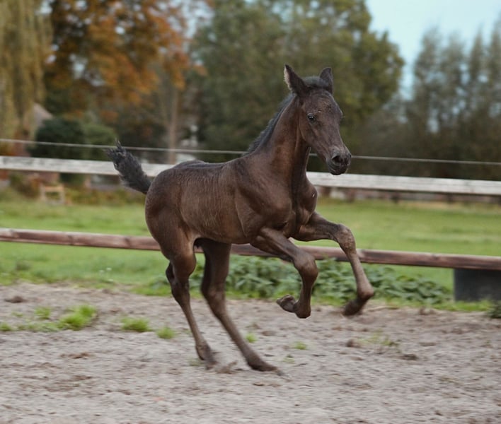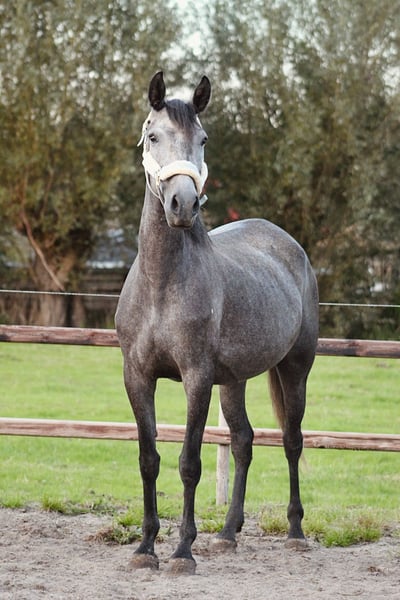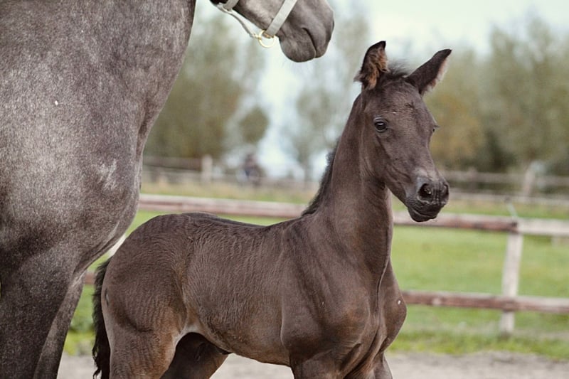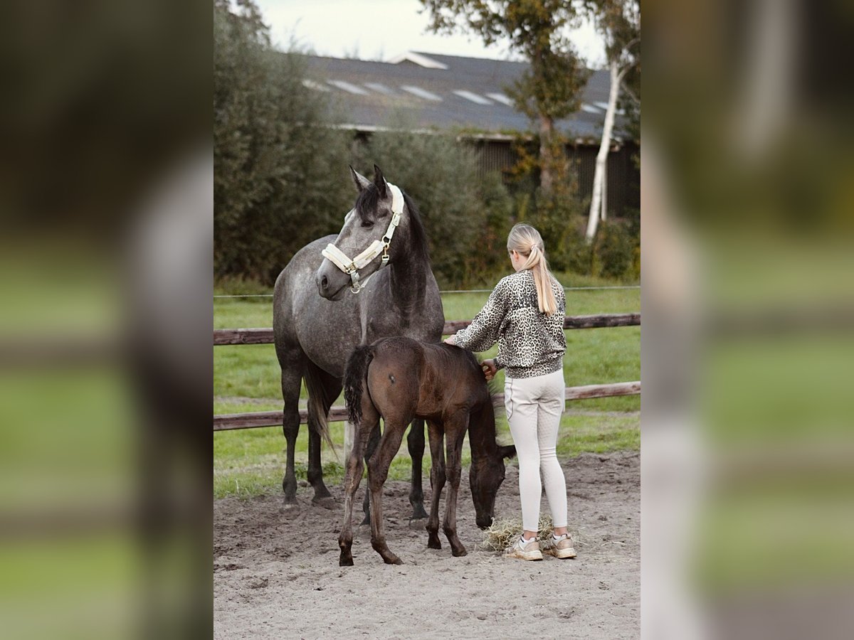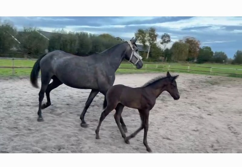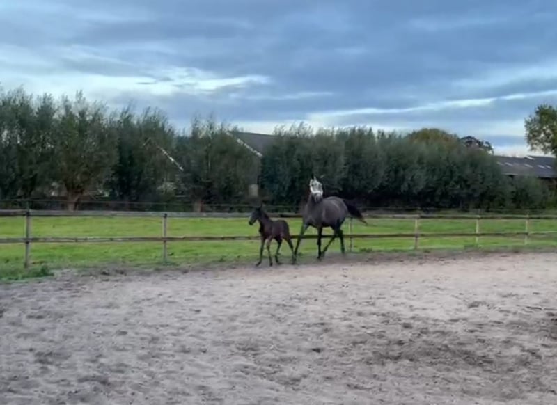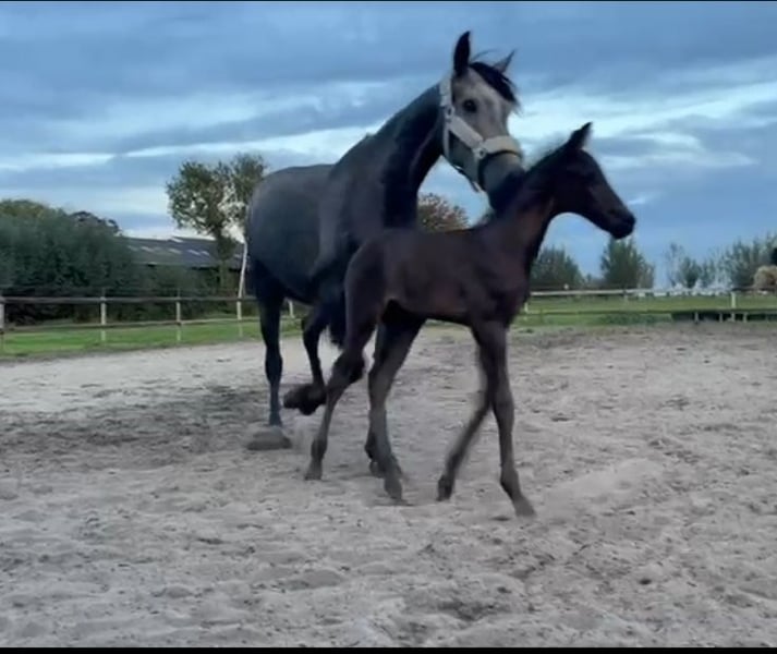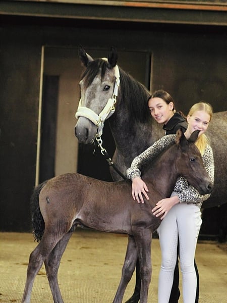 Super cute and sweet 4-year-old grey Andalusian mare, approximately 1.56 m tall, together with her stunning black crossbred Friesian foal. Nubia is a loving and caring mother, she moves very well and has beautiful, flowing gaits. Gentle and friendly in handling, she is now able to stand quietly at the wash station and is easy to groom, touch, and lead on walks. Nubia is ready to continue working with her new owner to build a strong bond and a bright future together. A fantastic opportunity for someone who wants to train their own horse with good character and attractive looks. A very nice horse to start working with and to shape according to your own preferences. Her gorgeous foal, named Zorro, who is now 1.5 months old, is included in the sale. Zorro is a very handsome, super easy-going, large black colt, sired by a Friesian. He is beautifully built with an elegant frame and moves exceptionally well, making him a real eye-catcher. A good home for both is essential! Traffic-safe, trailer-trained, and free of any defects. Stop searching, come quickly to see and fall in love with this wonderful pair! Transport can be arranged. If you cannot reach us, please send a WhatsApp message or email. For more information or to make an appointment, you can WhatsApp or call: +31 6 23 25 41 13.