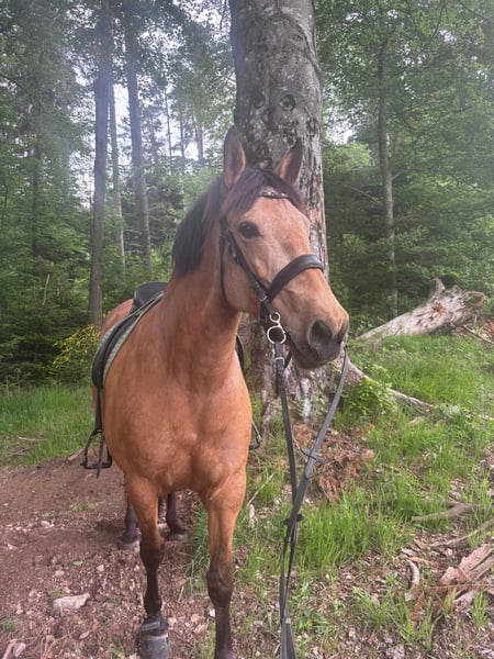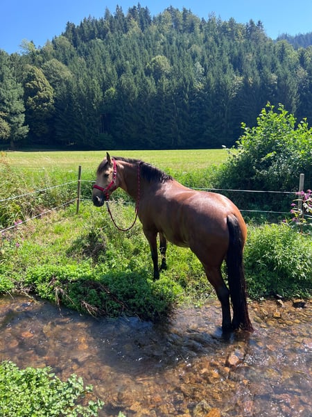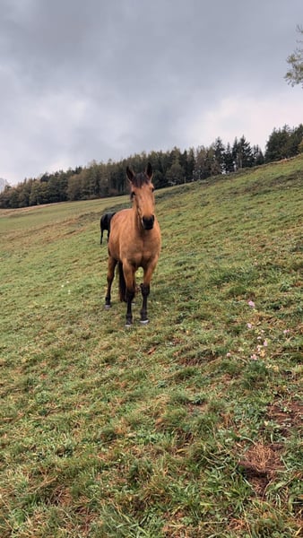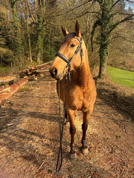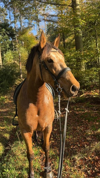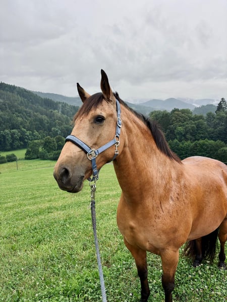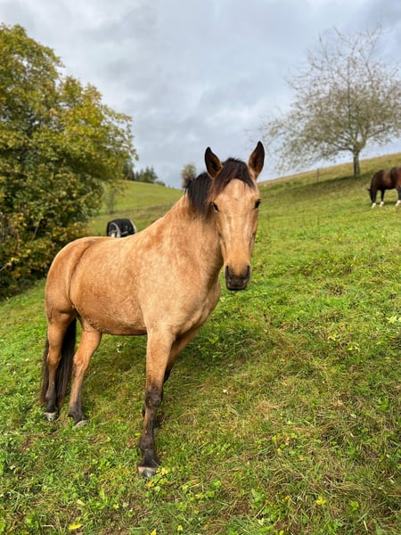 Schweren Herzens habe ich mich dazu entschlossen, für meine tolle Stute einen neuen Platz zu suchen, an dem sie gefördert und gefordert wird. Lucy ist eine 9-jährige Andalusier bzw. Cruzado-Stute, die ursprünglich aus Andalusien stammt. Sie ist ein wunderschöner Buckskin. Im Sommer hat sie fast eine goldene Farbe, wohingegen sie Winter heller wird. Sie ist - wie ihre Eltern - etwas stämmiger gebaut und ca. 1,60 m groß. Sie steht aktuell im Offenstall in einer gemischten Herde. Sie ist mit anderen Pferden - sowohl bekannt als auch unbekannt - unkompliziert im Umgang. Vor drei Jahren wurde sie positiv auf MIM getestet, mit guter Futtereinstellung und Bewegung haben wir damit jedoch keinerlei Probleme und Einschränkungen. Sonst ist Lucy komplett gesund, hatte bisher keine Koliken, schlimme Verletzungen oder sonstige Krankheiten. Sie überzeugt durch ihr ausgeprägtes Selbstbewusstsein und ihre hervorragende Arbeitseinstellung. Sie möchte ihrem Menschen stets gefallen, verfügt über eine hohe Auffassungsgabe und lernt sehr schnell. Dadurch ist sie vielseitig einsetzbar und stets motiviert bei der Arbeit. Im Umgang mit Kindern ist sie auch jederzeit sehr lieb und rücksichtsvoll. Sie ist englisch ausgebildet und wir waren bereits auf Reiterrallyes sowie auf Lehrgängen unterschiedlichster Art unterwegs. Von klassischem Springtraining über erste Erfahrungen in der Vielseitigkeit bis zur Working Equitation. In der Dressur befindet sie sich auf einem soliden E/A-Niveau. Seitengänge in Schritt und Trab sowie Schritt-Galopp-Übergänge sind ihr vertraut. Aktuell ist sie etwas aus dem Training und hat einige Kilos zu viel auf den Rippen, sodass man hier erst wieder etwas Kraft- und Konditionstraining machen sollte (das letzte Bild ist aus letztem Sommer, wo sie sehr gut im Training war). Lucy zeigt sich in allen Bereichen begeistert, neugierig und lernwillig. Ausritte meistert sie sowohl alleine als auch in der Gruppe souverän. Im Gelände ist sie unerschrocken und im Straßenverkehr absolut zuverlässig. Auch mit Hunden hat sie keinerlei Probleme, auch wenn dieser z.B. beim Ausritt nebenher rennt. Aktuell ist Lucy barhuf, trägt nur im Gelände vorne Hufschuhe und kommt damit sehr gut zurecht. Turniererfahrung hat Lucy bisher noch keine, wir schätzen sie jedoch auch in diesem Bereich als sehr unkompliziert ein. Sie ist verladefromm und kennt Hängerfahren sowohl alleine als auch zu zweit. Lucy sucht ihre Menschen und steht ihm aufgeschlossen gegenüber, allerdings braucht sie eine konsequente Führung, sonst neigt sie dazu diese selbst zu übernehmen. Daher ist sie nicht für Anfänger geeignet. Sie wird nicht an Händler sondern nur an eine Privatperson verkauft.