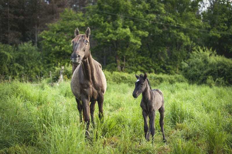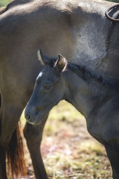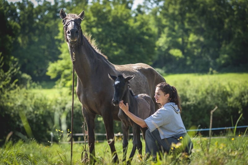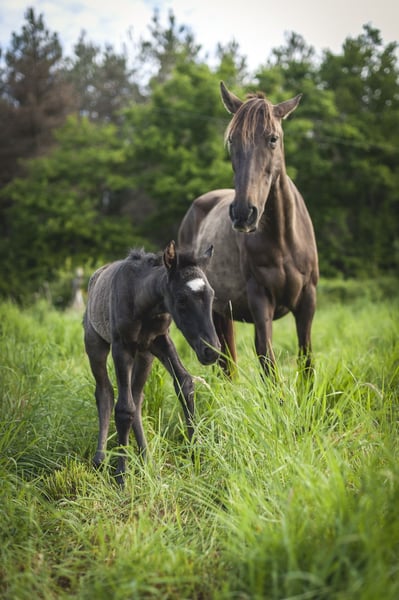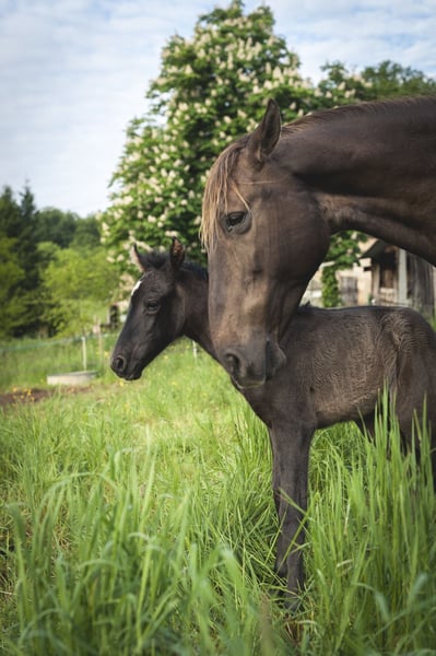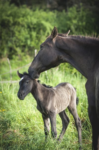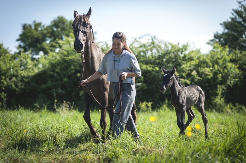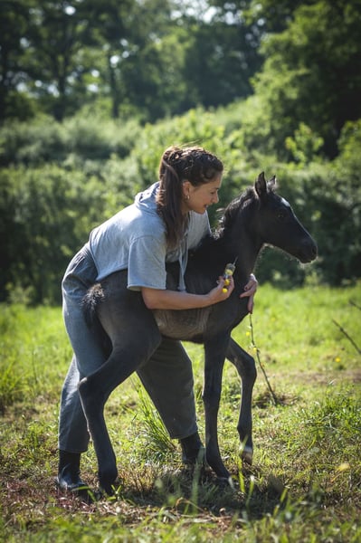 Poésie is a beautiful black pearl ND1 filly, very delicate. She is expected to measure 1.60m as an adult. She was born on May 6th during the night in excellent conditions! She will live in a herd until weaning (natural) between 10 and 15 months. She will receive the best care and the best education! If you like her, do not hesitate to contact me. I am stopping breeding, so she will not be PRE as I will not have her father approved. This is an opportunity for you to acquire a Spanish mare carrying pearl at a very gentle price.