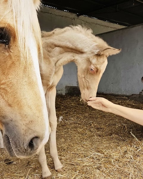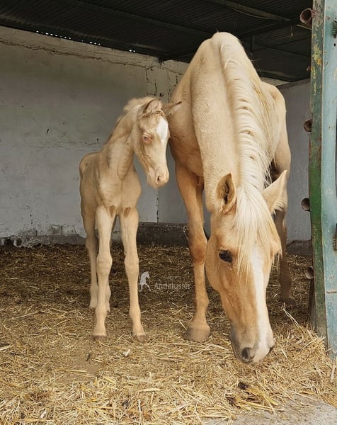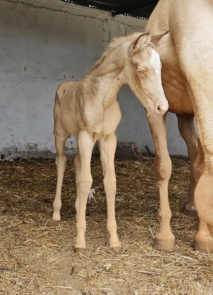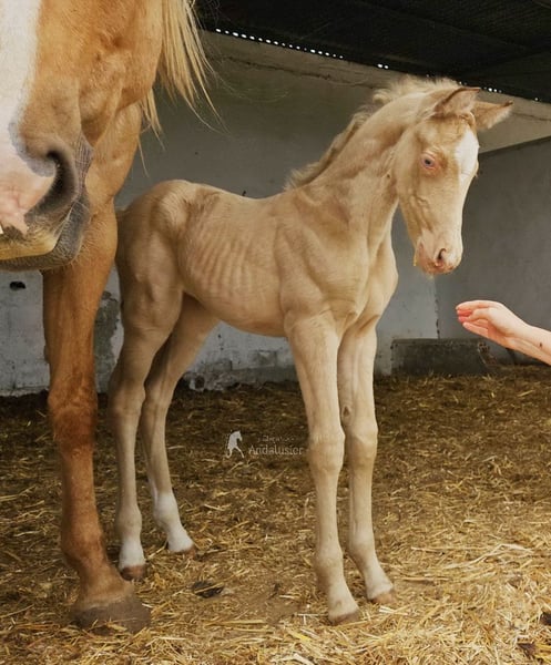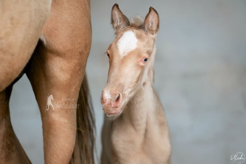 Dolce puledra di appena pochi giorni, Bayo Perla, di sangue Andaluso