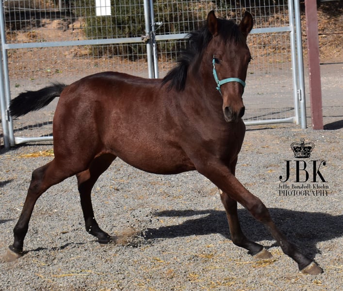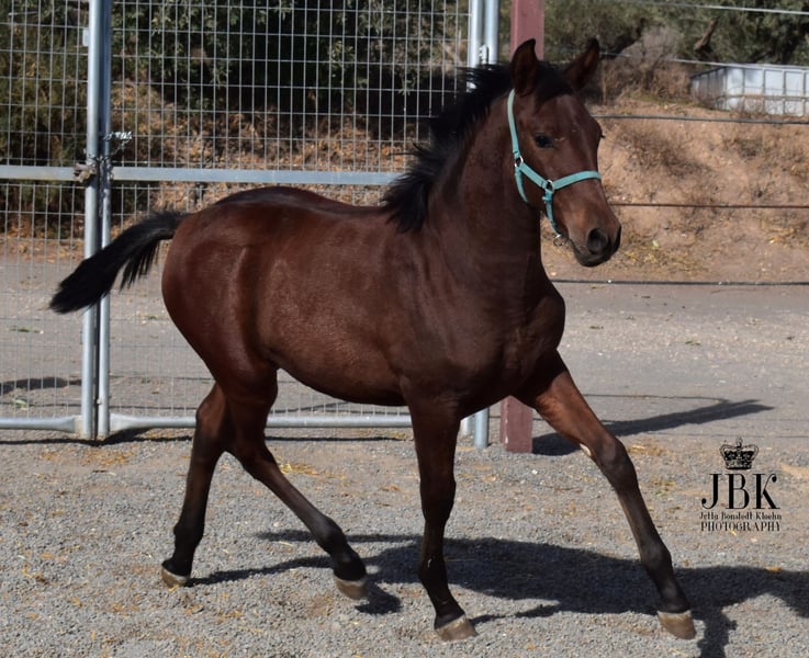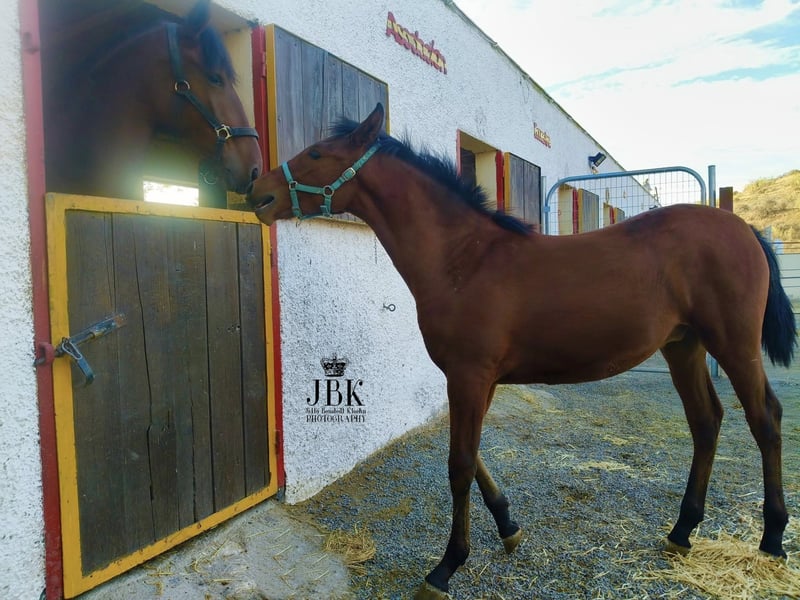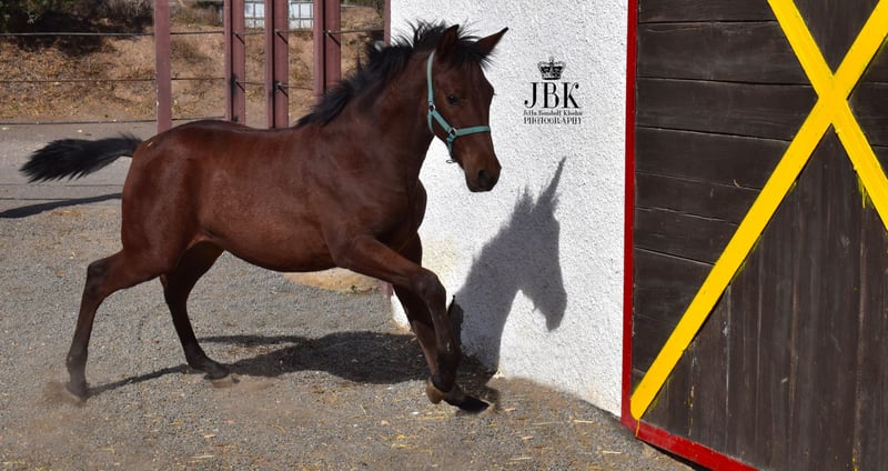 The Andalusian stallion Saleroso is an outgoing, confident foal with a wonderful presence and very elegant movement. He was born on April 29, 2025. His sire is a PRE Rapp stallion, very dark bay, and his dam is an Andalusian Lusitano mare. He is expected to reach a final height of around 1.63 meters (16.1 hh). No smaller. Saleroso is microchipped and has his EU passport. Currently, he is being introduced to basic foal handling, such as grooming, picking up hooves, and other small daily routines that will be important later. He is also in the process of weaning from his mother. So far, he has been very relaxed during these steps. He already allows halter handling and walks a few steps with guidance, following the handler with trust.