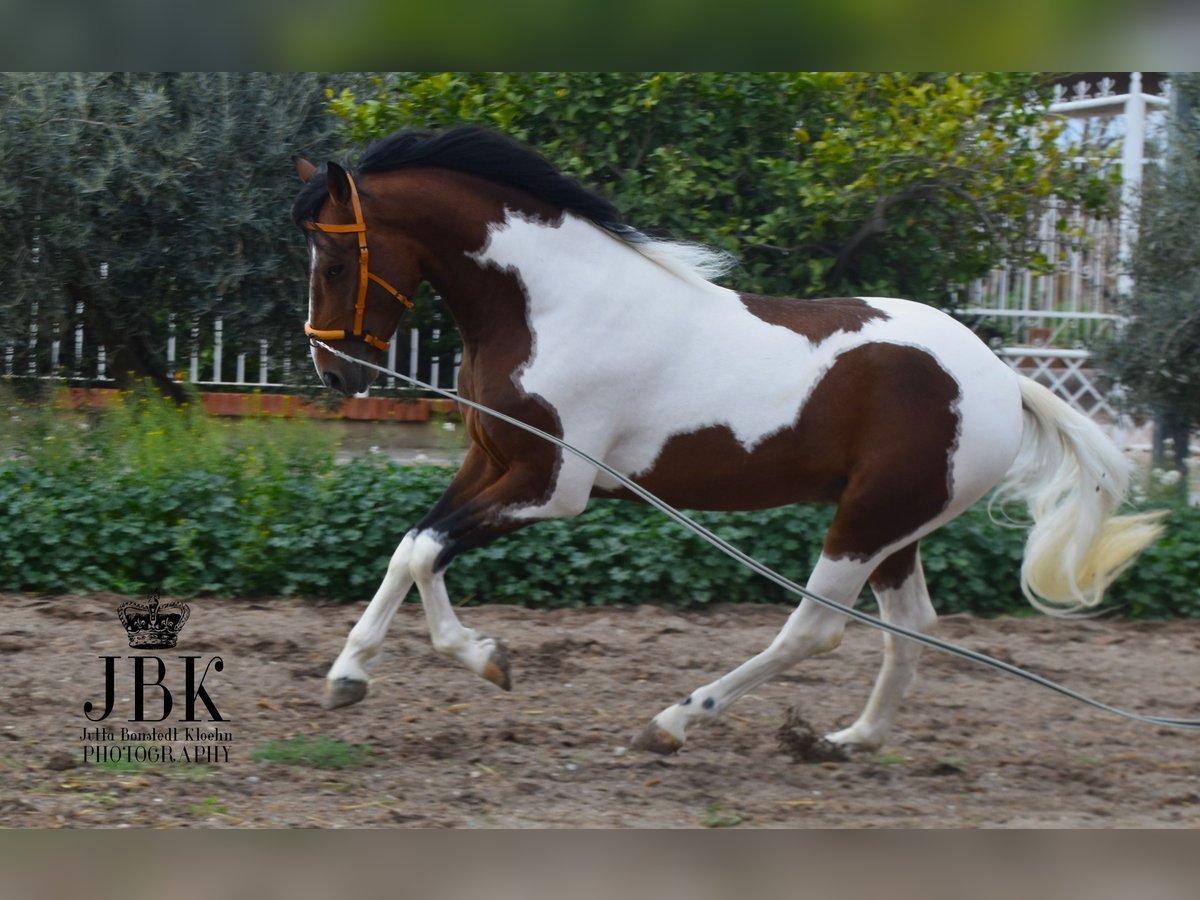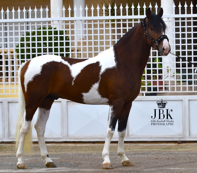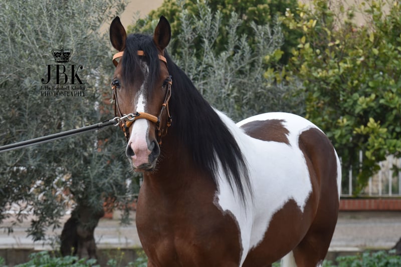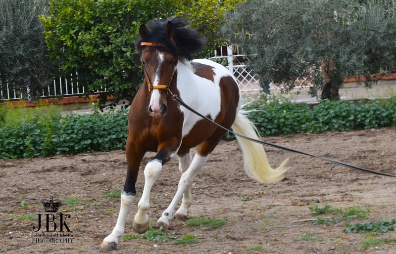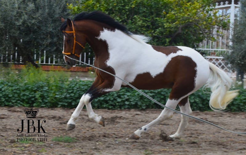 Este extraordinario caballo andaluz de capa castaña con manchas fue nacido el 1 de mayo de 2023. Tiene un hermoso patrón de manchas en su cuerpo, con un efecto marmolado en gris alrededor de sus manchas marrones. Actualmente, Bandolero está empezando a trabajar un poco en la cuerda y, debido a su juventud, aún necesita tiempo para desarrollarse. Sin embargo, ya domina lo básico en el manejo con las personas, como cepillarlo y atarlo, de manera excelente. Tiene un carácter astuto, es despierto y abierto a aprender cosas nuevas. Su altura a la cruz se estima en aproximadamente 1,58 a 1,60 m. Se puede castrar en el lugar si esto ayuda en la decisión de compra (el coste corre a cargo del comprador).