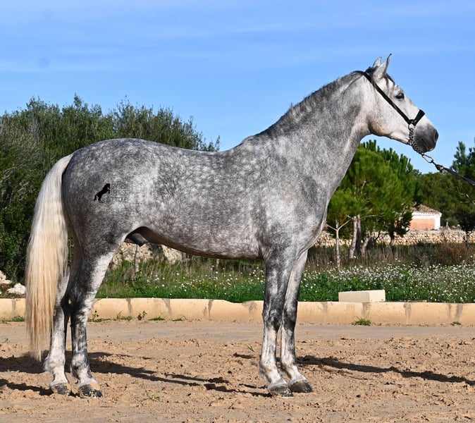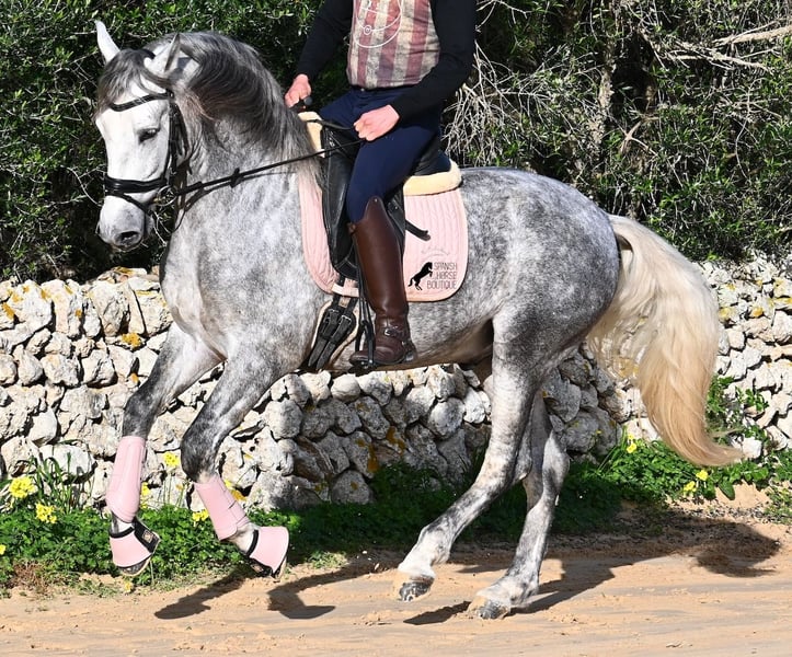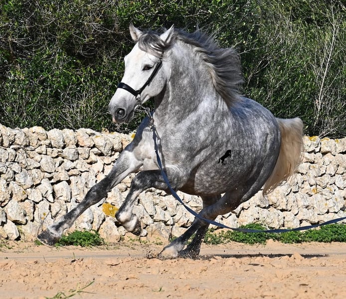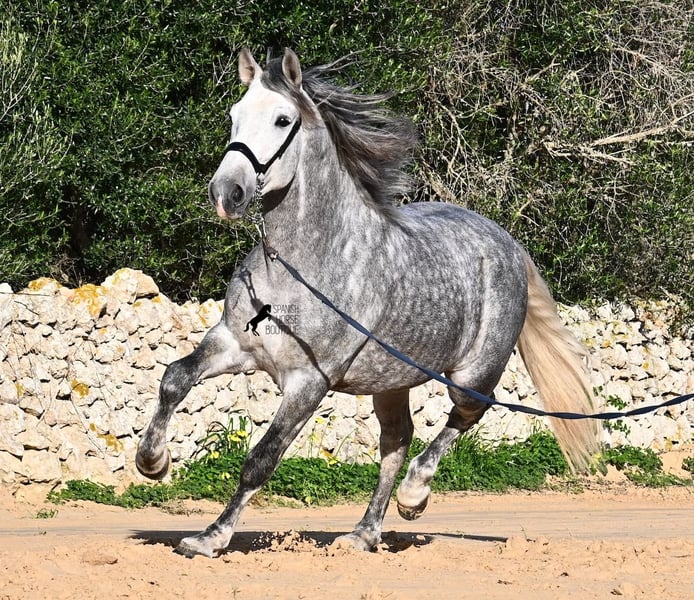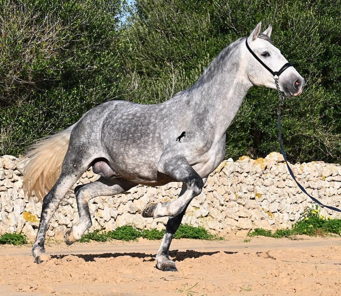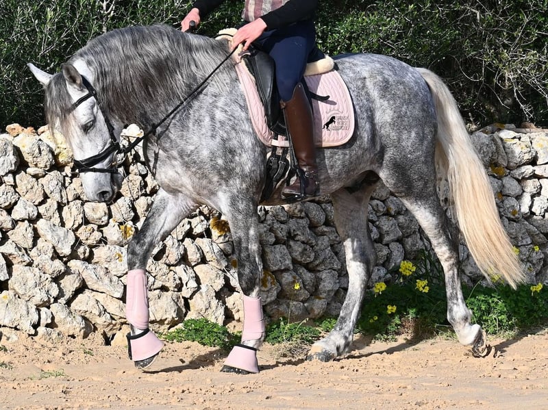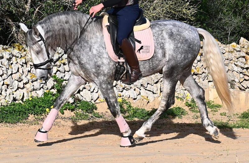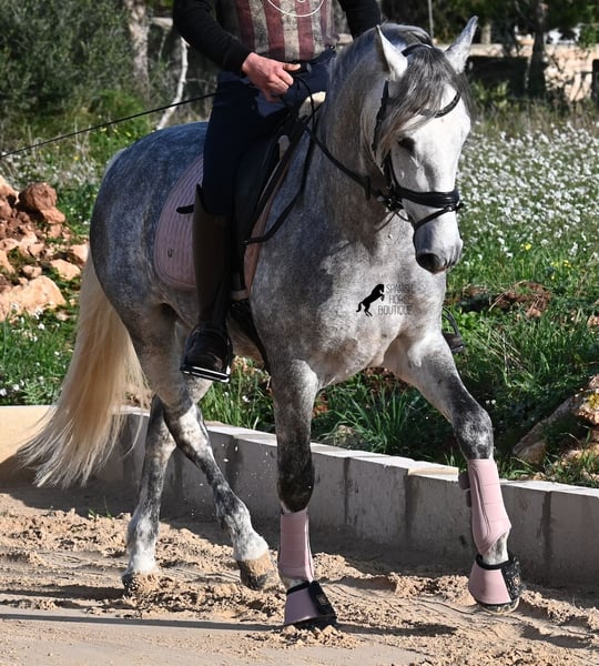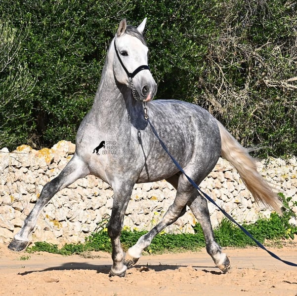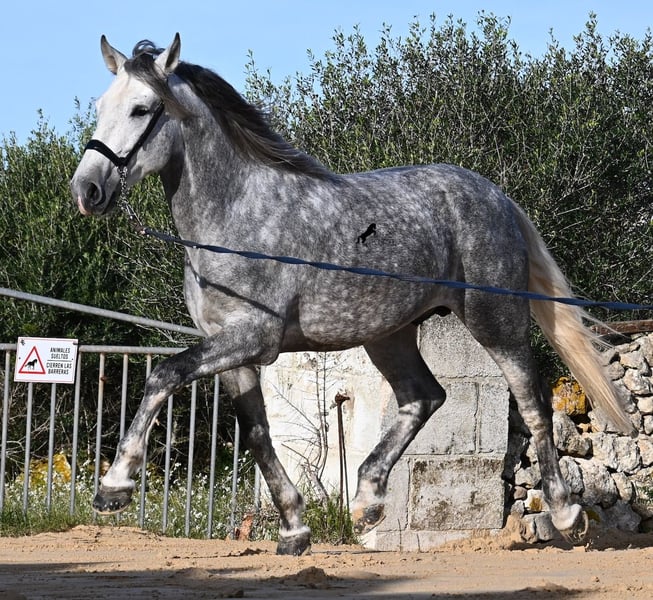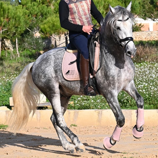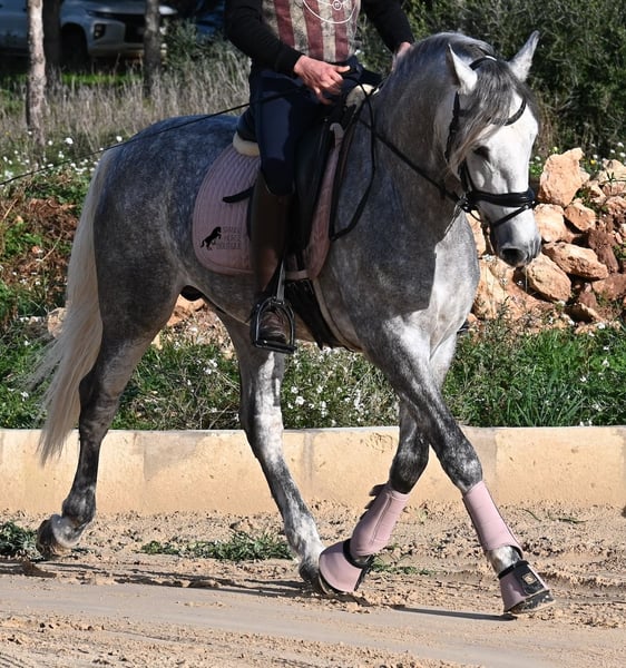 This 2021-born PRE stallion (Andalusian with ANCCE breed registration) is a small, baroque gem. His owner purchased him young (he was also x-rayed at that time, all Grade 1), but unfortunately, he is quite tall, and the stallion has decided to stay in a more manageable size. He has received basic training under saddle on a snaffle bit, but due to his owner's height, he is not able to develop correct leg aids, so a new home is sought with someone better suited physically. This handsome young horse is not only interesting as a riding horse but also for breeders, as his pedigree is outstanding! He is a grandson of Datil VII from RETAMALES, and on his dam's side, he descends from CAMPO BAJO, both lines known for their hardworking traits. His pedigree also includes PLAZA DE ARMAS and YEGUADA MILITAR (Cartujano). Under saddle, lateral work has already been introduced, and his conformation greatly benefits his movement, making him also suitable for working equitation. His canter is uphill and balanced, and he is increasingly learning to stretch and lift his back. He enjoys hacking out, and the variety from the arena helps him stay mentally fresh. He is kept in a paddock box but is also familiar with pasture turnout and full box stall housing. For those who cannot keep a stallion, castration on-site is an option. With a current height of 157 cm, he will remain compact and retains the classic type of the Spanish horse. He has not yet been used for breeding and is accustomed to being near mares. Price reflects his quality. His location is Menorca. Videos and pedigree details are available upon request. I am happy to arrange a pre-purchase exam, training, castration, transport, or even your trip to view him in person. Further details can be found on my website or through a direct conversation. Greetings from Spain