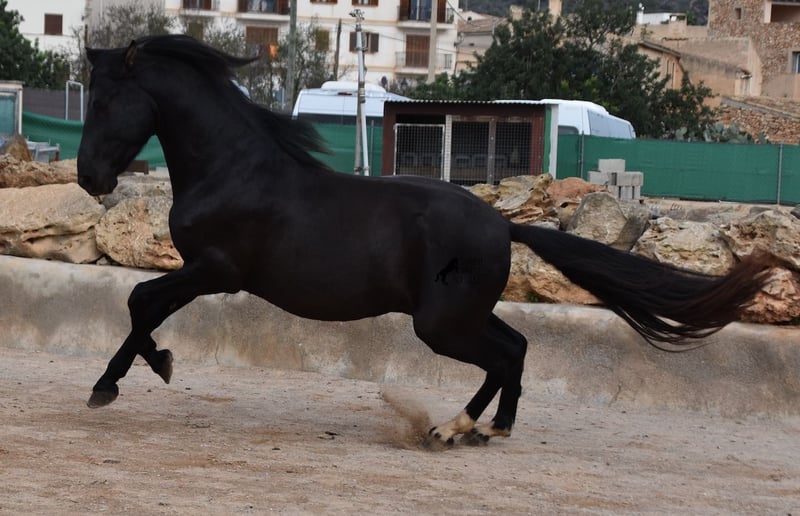 Hardly any other stallion has had as much success and is as famous as a Spanish dressage horse as POETA DE SUSAETA! And that is the sire of this baroque beauty, who has clearly also inherited good movement. This purebred Pura Raza Española stallion (Andalusian with ANCCE breed certificate), born in summer 2021, also has an excellent pedigree on his dam's side. There we find the Mejorante stallion NERO II and the ELITE stallion Inedito, both of whom are also great horses in the dressage world of the Spanish horse. And although the pedigree is very sporty, this youngster is beautifully compact and baroque, which makes him even more special. Plus the beautiful black coat and the lovely eyes - what more could you wish for? He has not yet been broken in, as it is important to the breeder that his horses have time to grow and are not overtaxed. This pays off, because the stallion is absolutely people-friendly, deeply relaxed, cuddly and a great guy all round. He lives next to mares, which doesn't interest him at all ;) He currently measures 159 cm and will grow a little more. He is barehoofed, lives in a stable and there is the possibility that he will be gelded and/or ridden on site. He is currently on Mallorca! Videos and pedigree available on request. A top horse at a very fair price. I would be happy to organize an AKU, riding, transport or even your trip if you come to see him in person. Details can be found on my website or in conversation. Saludos from Spain