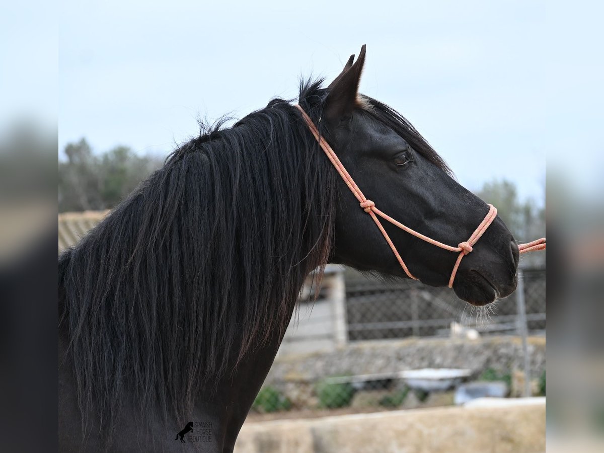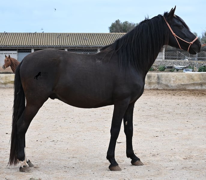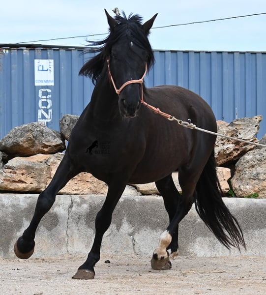 Few stallions have achieved as much success and fame as a Spanish dressage horse like POETA DE SUSAETA! He is also the sire of this impressive, baroque-looking colt, who has clearly inherited good movement as well. Born in summer 2021, this purebred Pura Raza Española stallion (Andalusian with ANCCE registration) also boasts an excellent pedigree on the dam’s side. His lineage includes the Mejorante stallion NERO II and the ELITE stallion Inedito, both renowned figures in the Spanish dressage world. Although his bloodlines are very sport-oriented, this young horse is nicely compact and baroque, which makes him even more special. His sleek black coat and gentle eyes complete the picture—what more could one wish for? He has not yet been backed, as the breeder prefers his horses to have time to grow and not be overburdened early on. This approach has paid off, as the stallion is extremely friendly, relaxed, affectionate, and overall a wonderful character. He is licensed and already has progeny; he lives a dream life—24/7 free turnout with his foal and dam! This is a very interesting opportunity for breeders, not only because of his pedigree but also due to his striking color. Perfect for those seeking an unspoiled horse partner with all doors open to leisure riding disciplines. Currently, he measures 159 cm and will likely grow a little more. He is barefoot, kept in a hardy environment, and there is the possibility of castration and/or training on-site. He is presently located in Mallorca! Videos and pedigree details are available upon request. A top-quality horse at a very fair price. I am happy to arrange on-site pre-purchase examinations, training, transport, or even your journey if you wish to view him personally. Please contact me for more details, either through my website or in conversation. Greetings from Spain!