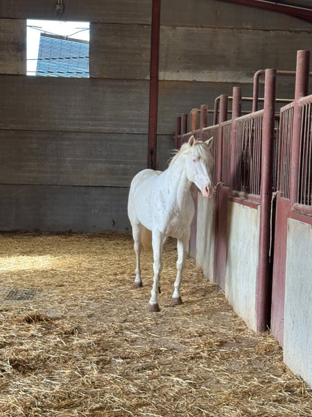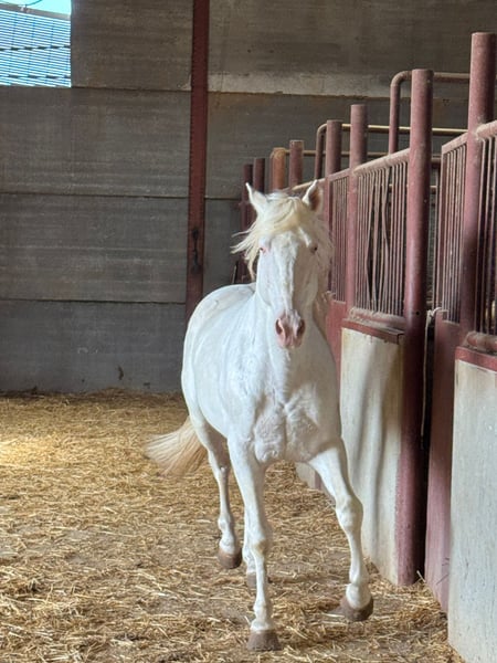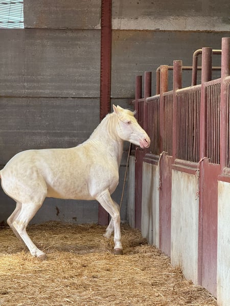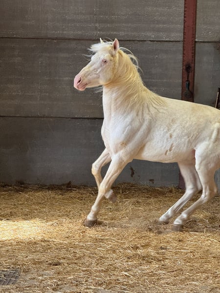 Excellent Baroque-style horse in Cremello with Palomino spots. Trained to walk, trot, and canter. Noted for its noble temperament.