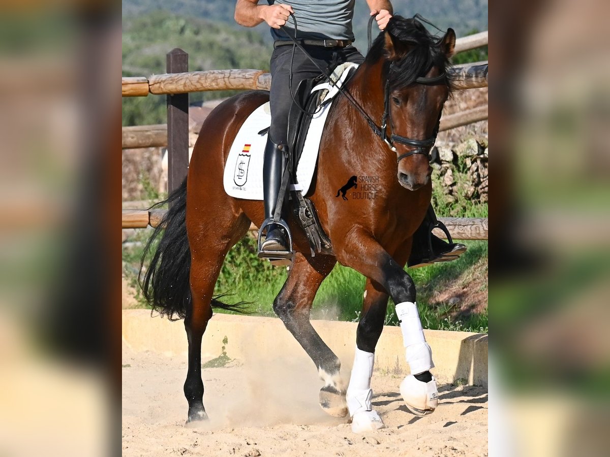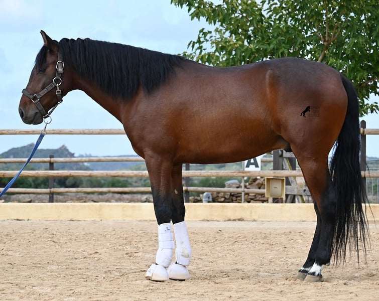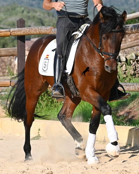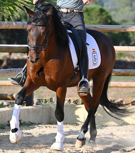 This 2020-born, purebred PRE stallion (Andalusian with breed certification from ANCCE) is a real powerhouse, bursting with energy at work! He comes from a loving breeder who understands that late developers like the Spaniards need what they truly require—time! Thus, he remained completely raw in the stallion herd until the age of 3, was then briefly stabled to learn the basics, and subsequently sent back to relax and process everything at his own pace. Currently, he has a solid foundation under saddle, with a particular focus on helping him learn to differentiate between his forward drive and relaxation phases under the rider. He is increasingly learning to carry himself, stretch, and extend his relaxation phases, which is wonderful to see. This is a horse that has not been rushed in training but has been allowed to find himself and learn to direct his energy. He has endless willingness to work! While others quickly tire, he gives even more and is tireless, making him an ideal horse for very ambitious riders who enjoy regular and targeted training. He is ridden in a double-jointed snaffle and is only shod on his front hooves. At night, he lives in a stallion paddock, which is very beneficial for his mental well-being, and during the day, he is in a box for attentive care, ensuring proper feeding. Trail rides on the hectare-sized area are also good for him, and you can really see how he finds his center as a positive change from the arena. On light workdays, he goes into the lungeing machine and continues to build muscle without carrying weight. In his pedigree, we find exceptional stallions such as YACO de TORRELUNA, ERMITAÑO III, and his brother is very successful in dressage, even reaching the SICAB (World Championship of the PRE). He has not yet covered any mares and is accustomed to being near mares, with the option for castration available on-site, of course. He currently stands at 157 cm and has a beautifully baroque conformation, with a fine Spanish head and good movements, making him interesting for many disciplines with a high level of work. Price category E-F! His location is Menorca. Videos and pedigree available upon request. I would be happy to organize an examination, training, castration, transport, or even your trip should you wish to come and see him in person. Details can be found on my page or in conversation. Greetings from Spain!