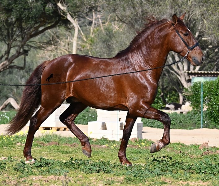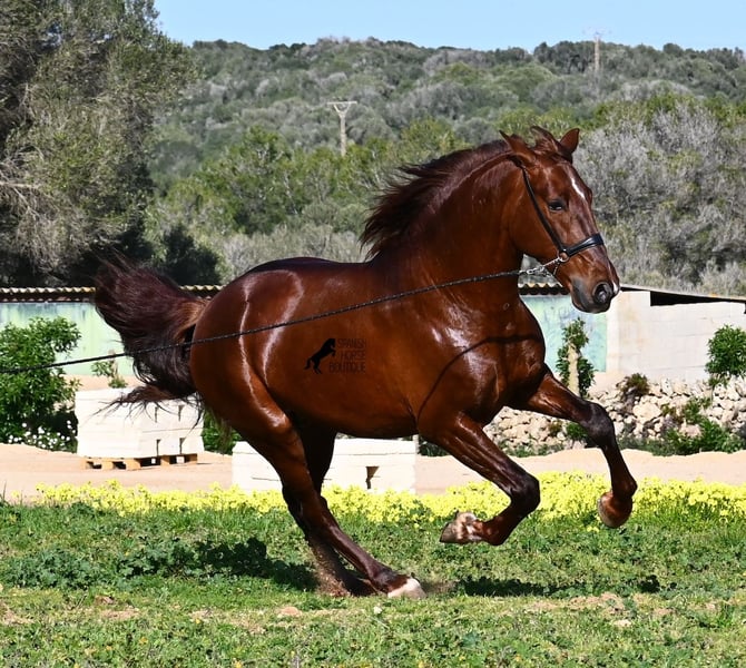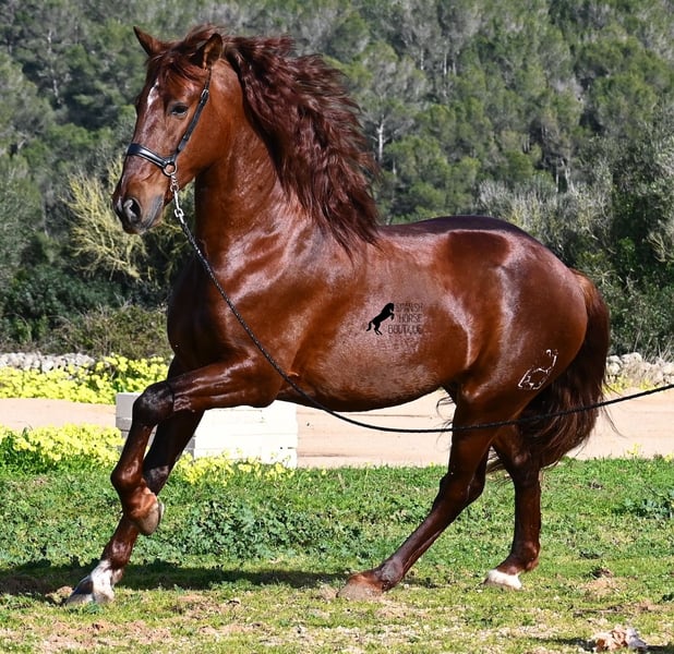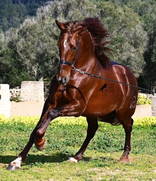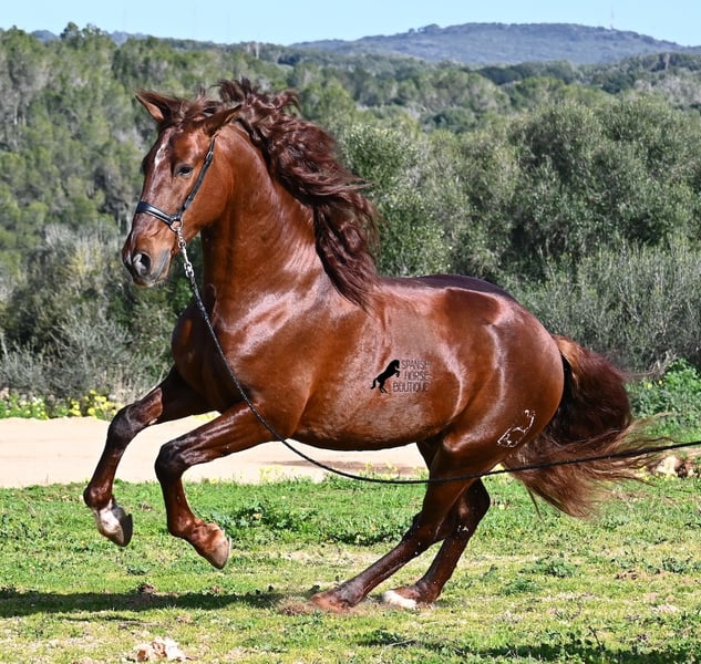 This PRE stallion (Andalusian with ANCCE breed certificate), born in 2020, is a real feast for the eyes in many respects! Without a doubt, the first thing you notice is his breathtaking beauty, which is only enhanced by the copper engraving in his coat and his esprit. But behind the beautiful façade, there is much more to discover. His pedigree is superior, as he is a son of the multiple WORLD CHAMPION Fer Bonachon de Eda and therefore a grandson of the famous Fer Bago. In his pedigree we find not only the world champion and thus the FERRERO line, but also Monis, Marin Garcia, Yeguada Militar, Guardiola and Bohorquez! On his dam's side, he has black, chestnut and bay in his pedigree, which also makes him very interesting as a breeding stallion, as most Bonachon children resemble their sire as gray and he passes on this TOP line, with more options for colored offspring. He is licensed and already has one offspring - also a chestnut, which confirms that he is more than interesting as a breeding stallion in terms of color, in addition to his pedigree. He is an absolute gentleman in handling and although he has already covered, he is not at all hot or stubborn. If stallion keeping is not possible, there is of course the option of castration on site. Ambitious riders will definitely have fun with him, because he learns quickly if you have the necessary sensitivity to channel his Spanish flame (fire would be an exaggeration), because under the rider he wants to give everything and really thaws out. He doesn't show any naughtiness under saddle either, but always wants to show more, which makes it better for him to have a rider who brings him into walk briefly on the long reins instead of pushing him. A beautiful stallion with a lot of potential in various disciplines that will please the eye and the heart! The price corresponds to the quality. His current height is 160cm. He is currently standing in Menorca! Videos and pedigree available on request. I would be happy to organize an AKU, castration, riding, transport or even your trip if you come to see him in person. Details can be found on my website or in conversation. Saludos from Spain
