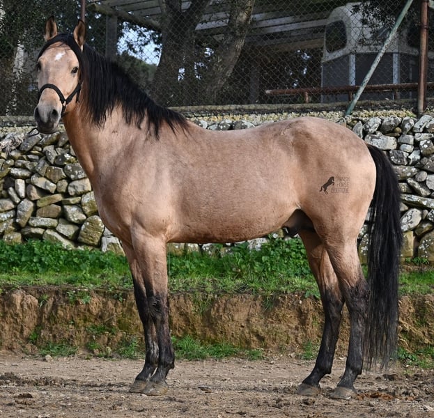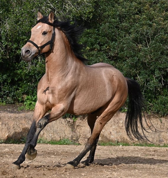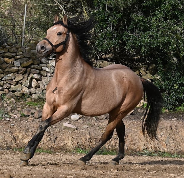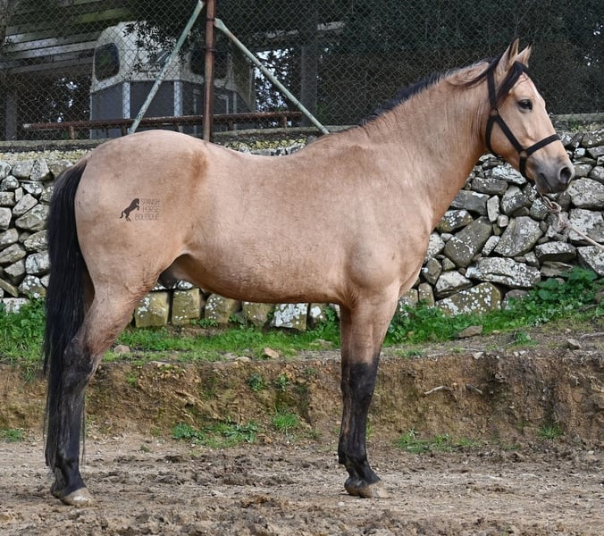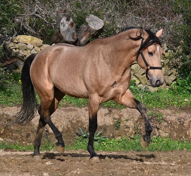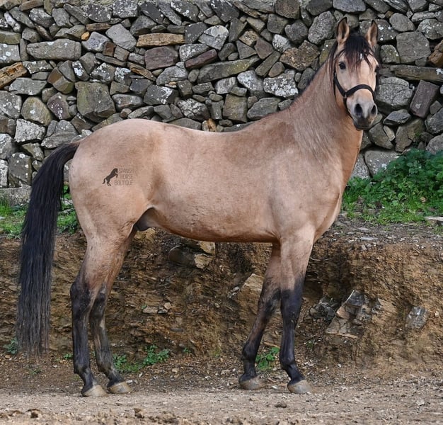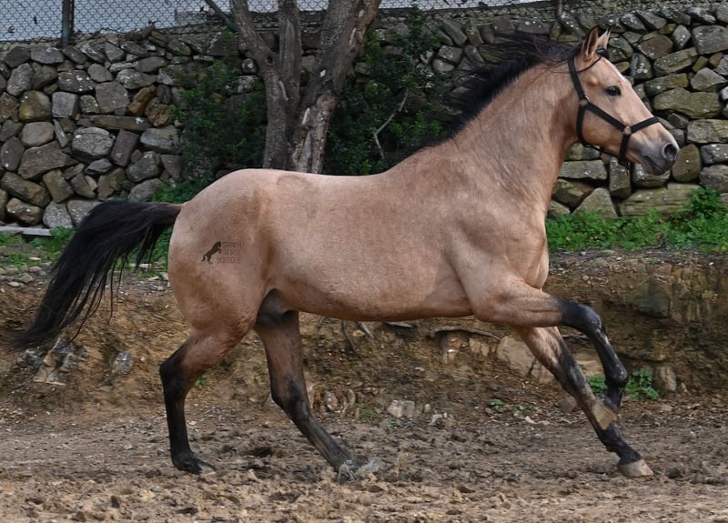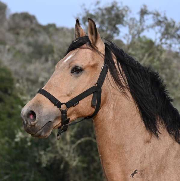 Dieser 2018 geborene Andalusierhengst, ist auf unserer schönen Insel Menorca eine Seltenheit. Unter unseren schwarzen Menorquin, gibt es kaum Falben und dieser kam als Jungpferd aus Madrid. Somit ist ihm das Thema Transport, nicht fremd, was ja nur ein Vorteil ist ;) Er ist auf Menorca unter robusten Bedingungen in der Hengstherde gestanden und wurde dann sehr spät angeritten. Sein sensibles, feinfühliges Wesen, hat nicht ganz zum Besitzer gepasst- das konnte er beim Fohlenkauf natürlich noch nicht abschätzen. So wurde der Hengst nur sehr wenig geritten und hat unterm Reiter eher das Niveau von einem 4 Jährigen. Es wurde immer liebevoll mit ihm umgegangen und er wurde auch nie überfordert, wenn man ihn nach langer Koppelpause mal wieder geritten hat. Er ist also ein Kandidat für jemanden, der erstmal Vertrauen aufbauen möchte und dann schonend weiter ausbildet. Für Reitanfänger ist er daher nicht geeignet. Unarten hat er keine und auch überhaupt kein Hengstverhalten, aber er zeigt sofort, er möchte sich gerne führen lassen, vertrauen und sich anlehnen können. Also kein Typ der "mit dem Kopf durch die Wand geht", sondern vorsichtig ist, sich lieber unterordnet und dann entspannt er auch, weil er merkt, er ist beschützt. Paddock- und Boxenhaltung sind ihm bekannt, er war schon öfters im Gelände und auch da- er muss einem Vertrauen, um zu entspannen. Mit 158cm hat er eine gute Größe und mit besserer Bemuskelung, wird er auch nochmal hübscher :) Barhuf kommt er auch gut zurecht und geht auch gut über unsere felsigen Böden. Ein schöner Bub zu einem fairen Preis und offen für viele Sparten. Sein Standort ist Menorca. Videos gerne auf Anfrage. Gerne organisiere ich vor Ort eine AKU, Beritt, Kastration, Transport oder auch ihre Reise, sollten Sie persönlich zum Anschauen kommen. Details dazu gerne auf meiner Seite oder im Gespräch. Saludos aus Spanien