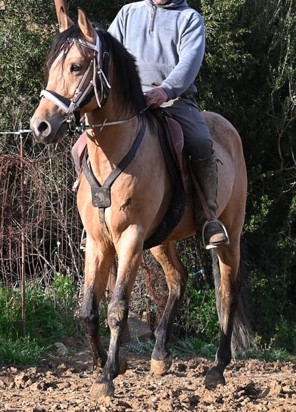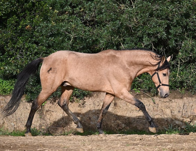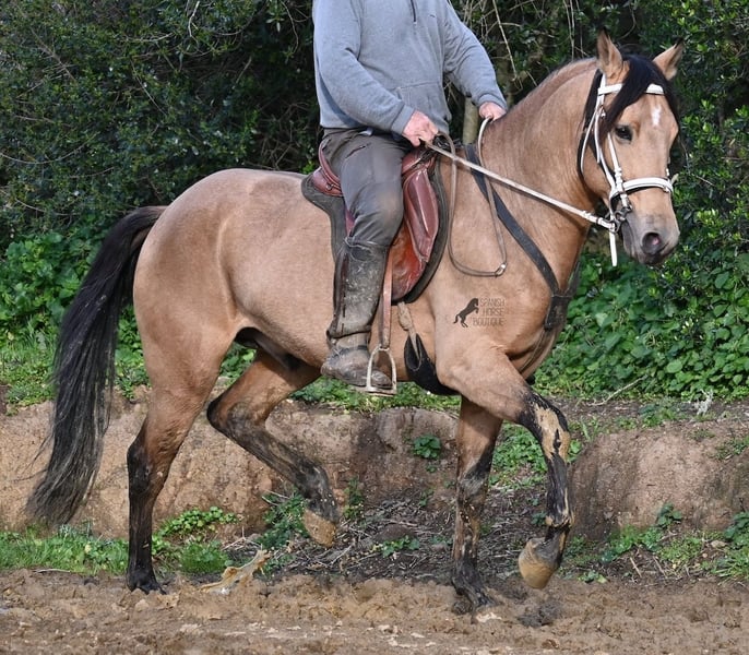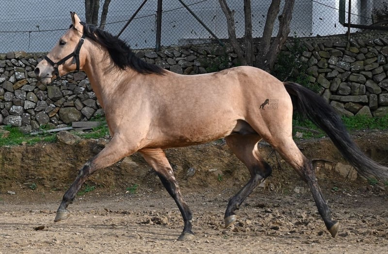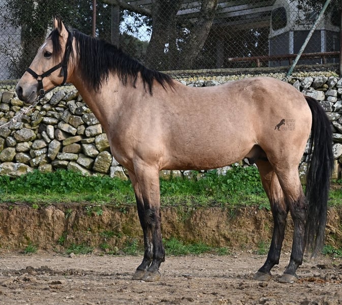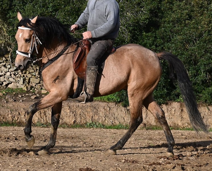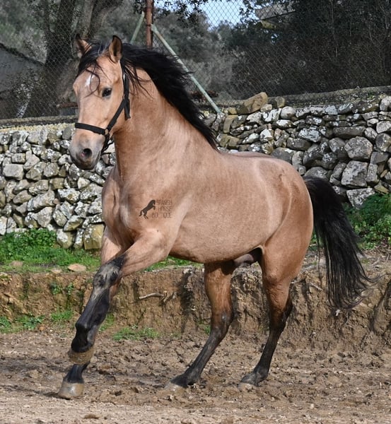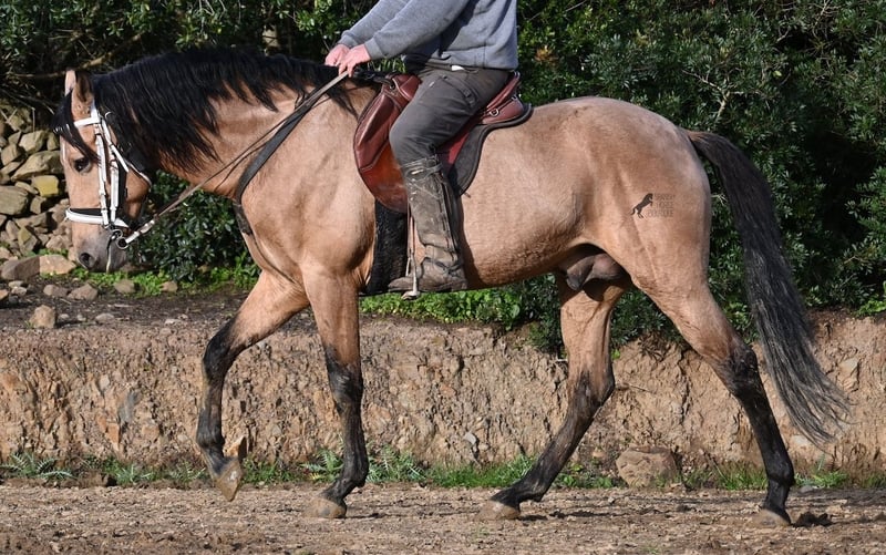 Dieser 2018 geborene Andalusierhengst, ist auf unserer schönen Insel Menorca eine Seltenheit. Unter unseren schwarzen Menorquin, gibt es kaum Falben und dieser kam als Jungpferd aus Madrid. Somit ist ihm das Thema Transport, nicht fremd, was ja nur ein Vorteil ist ;) Er ist auf Menorca unter robusten Bedingungen in der Hengstherde gestanden und wurde dann sehr spät angeritten. Sein sensibles, feinfühliges Wesen, hat nicht ganz zum Besitzer gepasst- das konnte er beim Fohlenkauf natürlich noch nicht abschätzen. So wurde der Hengst nur sehr wenig geritten und hat unterm Reiter eher das Niveau von einem 4 Jährigen. Es wurde immer liebevoll mit ihm umgegangen und er wurde auch nie überfordert, wenn man ihn nach langer Koppelpause mal wieder geritten hat. Er ist also ein Kandidat für jemanden, der erstmal Vertrauen aufbauen möchte und dann schonend weiter ausbildet. Für Reitanfänger ist er daher nicht geeignet. Unarten hat er keine und auch überhaupt kein Hengstverhalten, aber er zeigt sofort, er möchte sich gerne führen lassen, vertrauen und sich anlehnen können. Also kein Typ der "mit dem Kopf durch die Wand geht", sondern vorsichtig ist, sich lieber unterordnet und dann entspannt er auch, weil er merkt, er ist beschützt. Paddock- und Boxenhaltung sind ihm bekannt, er war schon öfters im Gelände und auch da- er muss einem Vertrauen, um zu entspannen. Mit 158cm hat er eine gute Größe und mit besserer Bemuskelung, wird er auch nochmal hübscher :) Barhuf kommt er auch gut zurecht und geht auch gut über unsere felsigen Böden. Ein schöner Bub zu einem fairen Preis und offen für viele Sparten. Sein Standort ist Menorca. Videos gerne auf Anfrage. Gerne organisiere ich vor Ort eine AKU, Beritt, Kastration, Transport oder auch ihre Reise, sollten Sie persönlich zum Anschauen kommen. Details dazu gerne auf meiner Seite oder im Gespräch. Saludos aus Spanien