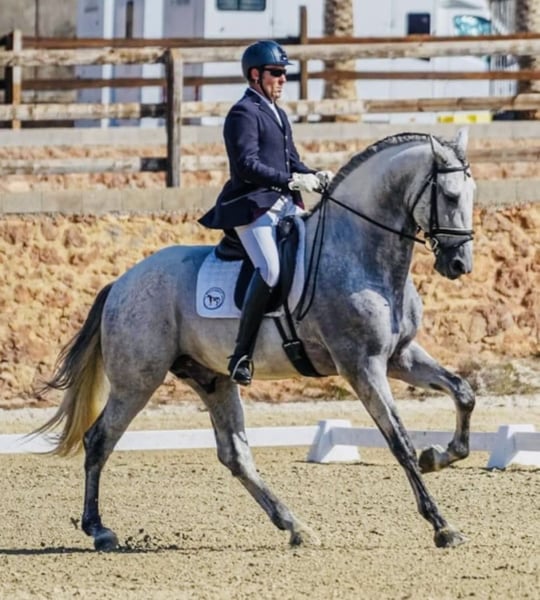 For sale: a stunning seven-year-old purebred Spanish horse (PRE), standing 17.7 hands tall, with a strong build. Healthy, very gentle, and suitable for riders of all levels. Highly trained in classical dressage. Registered as a stallion in the official PRE studbook. Sold directly from the breeding farm. Always ridden by the same professional rider from the farm. A reliable and proven horse, highly recommended for classical dressage competitions or leisure riding. His temperament is exceptional, and he has three very good gaits. Reasonably priced.