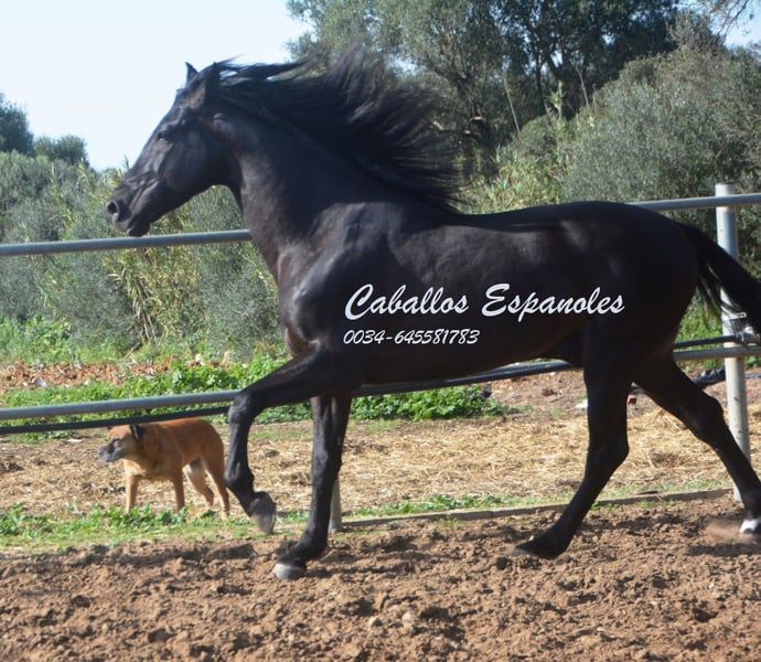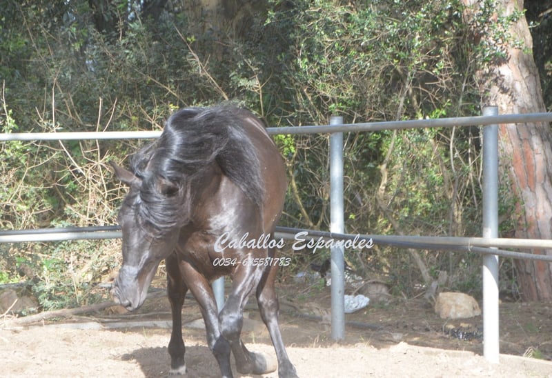 Ten czarny andaluzyjski ogier to uczta dla oczu. Ten fantastyczny czarny ogier jest wyposażony w trzy bardzo dobre podstawowe chody. Chody boczne, piaffe w ręku i hiszpański chód w ręku. Jest pracowity i nieustraszony na arenie, w terenie lub w Romerias. Koń jest sprzedawany na zlecenie. Może zostać z nami w treningu. AKU może być zorganizowane w krótkim czasie. Transport międzynarodowy.