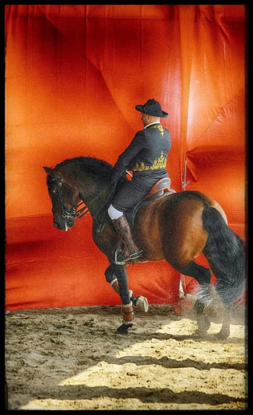 Splendido stallone pura razza spagnola, 9 anni, 166 al garrese. Esemplare tipico spagnolo, morfologia corretta, presenza scenica e carattere molto equilibrato. Senza alcun vizzio o paure. Ha partecipato a gare di dressage FISE fino a categorie F. Esegue lavoro in piano ( lavori laterali, cessioni, spalle in dentro, groppa in dentro, groppa in fuori, piroette passo trotto galoppo) lavoro in alta scuola piaffe, passo spagnolo, inchino e passage quasi confermato, tuttora in lavoro per cambi di galoppo al volo. Esperienza consolidata anche in fiere e spettacoli, bravo anche in passeggiata. Per info. Contattare 0039-3337133922
