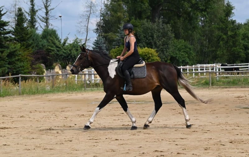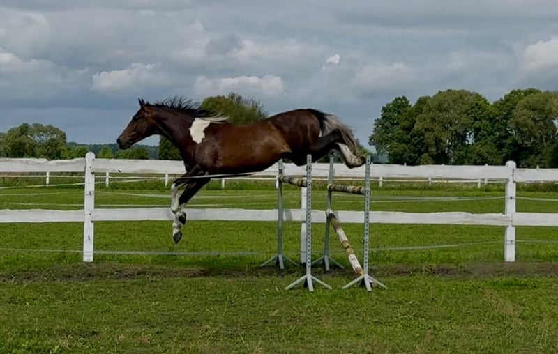For sale 5-yo piebald lovely gelding. Tall, frame-like, correctly built on strong straight legs and strong deep hooves. Beautifully colored piebald in a chocolate shade. Very calm pro-human character. Brave, easy-going and calm in handling and under saddle. He is not electric or excitable, a wise thinking horse, willing to cooperate with people. Initially broken in last autumn, without rushing or patents. Works in the arena and in the land. Very easy and nice to ride, brave not spooky or electric.. Safe in traffic, dogs, cars etc. Experienced in trails The horse shows jumping predispositions and very good technique. Currently 170 cm Great jumping pedigree from polish angloarab horses: Father Jaśmin: Extremely handsome, correct in build, endowed with very good movement and jumping technique. The horse characterized by good health, balanced temperament is the Vice-Champion tests in 2010, which he passed with a top results. The horse became the Vice-Champion and gold medalist of national championship in 2011. Jaśmin comes from the very distinguished female line of the mare Śmigła, from which such horses as: Jard: IV place at the German Eventing Championships 2022, Jaskinia: II place polish champoship C class 2004, Jamajka: IV place polish championship C class 2008. Grandpa Frazes (Level 150 cm) An Anglo-Arabian stallion bred and own by State Stud. As a young horse, this very good jumper was subjected to sports training both in eventing and show jumping. In 2003, he won the title of Polish Champion of Young Eventing Horses in the four-year-old category. In 2004 he came 12th (out of 66 competing horses) at the Polish Young Horses Jumping Championships in the five-year-old category, making only one mistake during the three days of competition. In 2006 he came 5th at the Polish Championships in jumping in the seven-year-old category. He successfully competed in jumping in the years 2007-2009. Frazes's offspring presented themselves positively at the National Youth Championships of Małopolska(angloarab) Horses in Białka and (older generations) at the Training Plant. Two daughters from the first youth generation by Frazes received a very good mark and took the two top places in the performance tests in 2009. In the same year, Frazes' son, Dionizos, won the stallion performance test at Bogusławice with excellent marks, and a year later Jaśmin came second, also receiving a very good mark. In 2010 Frazes went on a few months' lease to France. Further in the pedigree we have the outstanding stallion Arcus xx (level 160 cm) stallions Sebastian (140 cm) , Paszkwil, Agrest ... A very future horse for sports or leuisure in a beautiful unusual color. Free jumping easily 145 cm , under the rider 80 cm so far due to his young age . Healthy, run, well-groomed, fed with high quality feed, daily on the paddock with a group of friends. Price + 8% VAT We have more nice and quality angloarab horses for sale . Located in 50 km from PL/D border. Transport can be arranged. More on whatsApp + 48 513 179 245