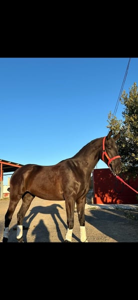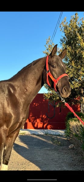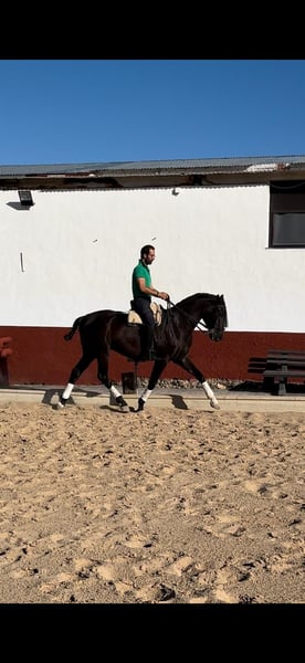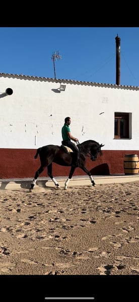 Caballo cruzado padre lusitano madre Anglo árabe. Hace espaldas adentro, cesiones a la pierna, apoyos y piruetas, está empezando con los cambios de pie. Sale al campo y a romerías