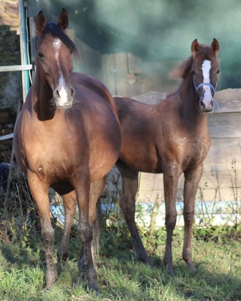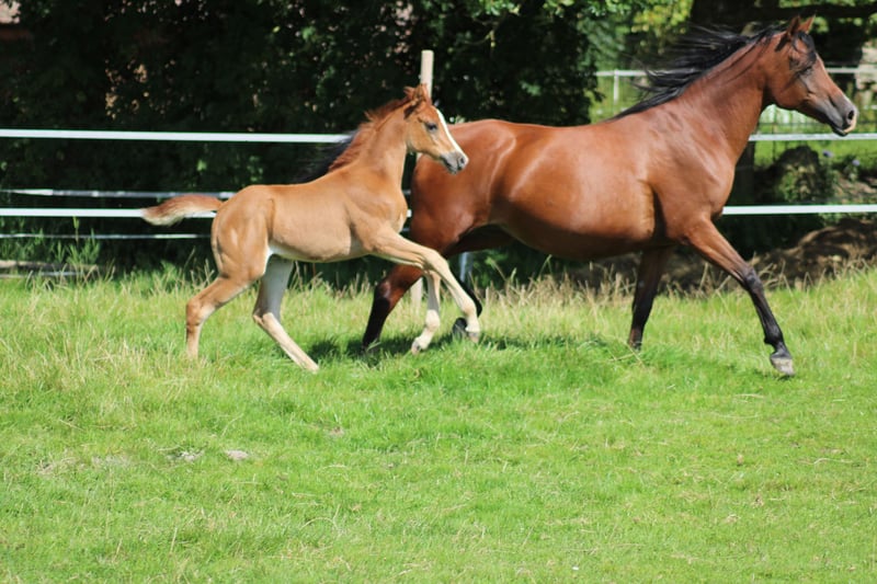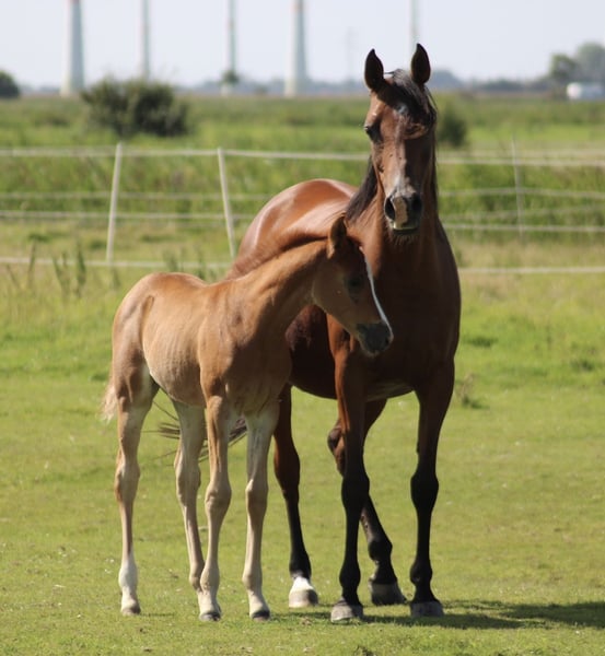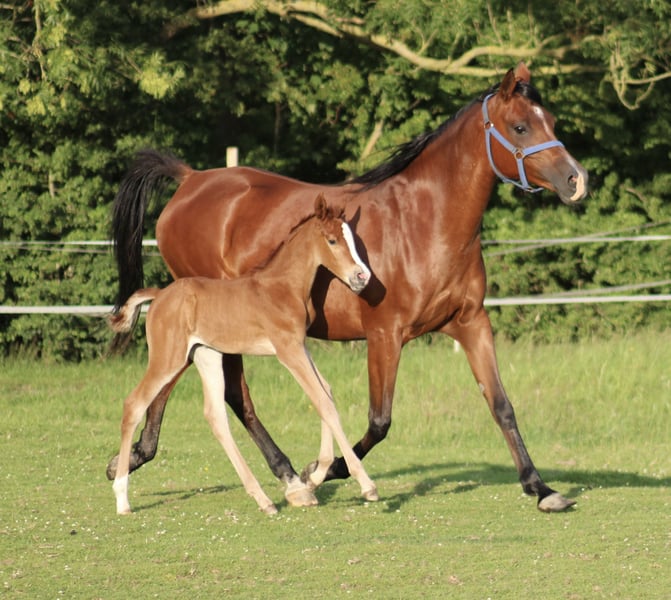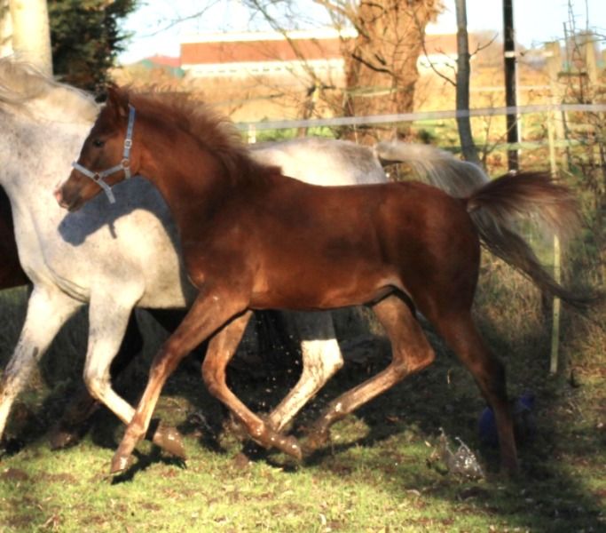 Verkaufe elegante Anglo-Araber Stute aus eigener Zucht SK Tazira wurde Ende Juni 2025 geboren und nun schonend von ihrer Mutter abgesetzt. Sie ist ein freundliches, unkompliziertes, hübsches Fohlen mit einem sehr gut gelungenen Exterieur, was ihr auch eine Fohlenprämie des Zuchtverbandes einbrachte. Ihre Mutter (Verbandsprämienstute) ist zur Hälfte rein Ägyptisch und rein russisch, mit hervorragender Abstammung. Tazira ist ihr zweites Fohlen und und sie hat es toll gemacht mit Liebe und Sorgfalt, so das ich denke, dass auch Tazira mal eine gute Mutter werden wird. Der englische Vollbluthengst Asagao (Züchter Markus Hoffrogge) wurde in diversen deutschen Zuchtverbänden gekört und hat einen hervoragenden 70 Tage-Test in Marbach (2013) absolviert. Für seinen Charakter, Leistungsbereitschaft sowie Springanlage und Galopp im Gelände erhielt er jeweils die Wertnote 9,0. Viele seiner Kinder sind in der Vielseitigkeit erfolgreich und Einige hoch plaziert im Bundeschampionat. Natürlich sind alle Sparten der Reiterei offen. Ich selbst bin dem Distanzreiten zugetan und könnte mir gut vorstellen, dass Tazira das auch super meistern wird. Ich halte meine Pferde so, dass sie immer ausgiebig laufen können, auch im Winter. Kleine Ausläufe, ohne Galoppiermöglichkeiten gibt es bei mir nicht. Die Fotos zeigen SK Tazira in verschiedene Zeitabschnitte. Von zwei Tage nach der Geburt bis heute Bei Interesse stehe ich gerne für weitere Informationen und eine Besichtigung zur Verfügung.