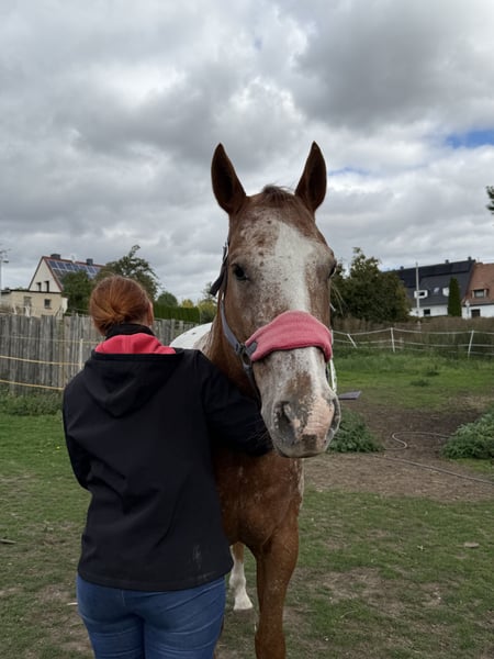 Chamàn is a 14-year-old Appaloosa gelding with a height of approximately 1.64 m. We bought him from Spain, where he was kept with the gray mare that is with us. He is currently being ridden as a leisure horse and is particularly suitable for riders looking for a calm and fearless partner. ✨ Character: Chamàn is an absolute XXL teddy bear who quickly wins hearts with his calm and relaxed nature. He is good-natured, fearless, and also suitable for children. At the same time, he sometimes has his "own mind" and can be a bit stubborn – he needs a rider who can set clear, loving boundaries. Training & Use: • Basic training at an elite school in France • Leisure horse with a love for jumping • Well-behaved in the field, both alone and in a group • Proven in open stabling and suitable for herd life (currently in a small herd) Health & Care: • Regularly vaccinated, dewormed, and cared for by a veterinarian • Barefoot, according to the previous owner, may need hoof boots in front after trimming, but so far no problems with us • Shoeing and loading friendly Miscellaneous: Chamàn is a reliable, fearless companion who is not easily disturbed. Due to increasing difficulties with the mares in our herd, we are now looking for a new home for him where he can continue to be developed and live out his loving XXL teddy bear nature. For a trial ride, we charge a protection fee of €30, which must be paid in cash in advance. Of course, this amount will be fully credited towards the purchase. If you are interested or have any questions, I am happy to assist. *It does not benefit any of us if the horse just ends up on your watchlist; everything is negotiable, and we don't bite.