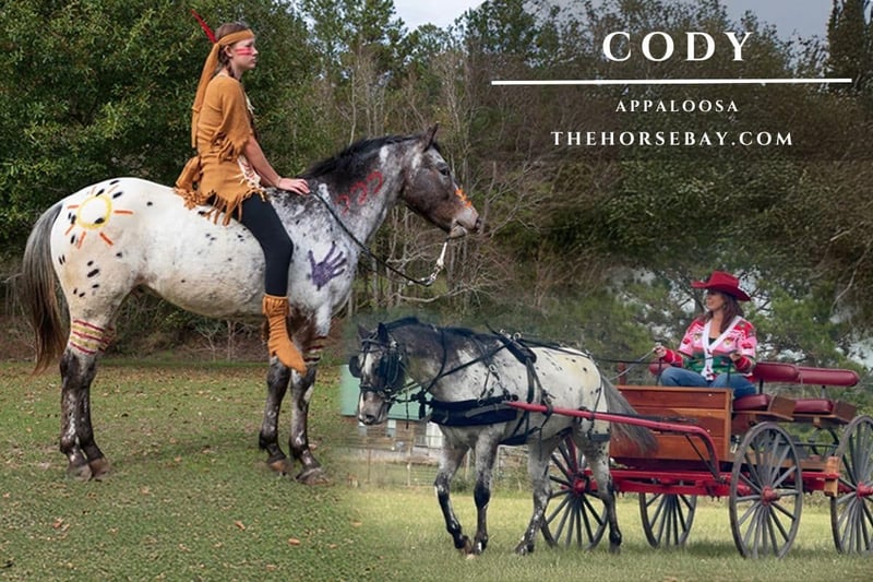 Cody to piękny ogier Appaloosa. Ma 5 lat i ma wysokość około 14 handów. Jest dobrze zbudowany (krępy). Posiada mikroczip dla stałej identyfikacji. Cody był używany we wszystkich fazach pracy na ranczo. Brał udział w wielu przejażdżkach trailowych, jeździli na nim początkujący i młodzież. Jest bezpieczny na drodze, nie boi się wyzwań i przejdzie lub przejdzie przez wszystko, co napotka – wodę, mosty, kłody, dziką przyrodę itp. Cody to świetny koń do zaprzęgu. Był prowadzony przez miasto i po wiejskich drogach. Jeśli potrafisz prowadzić zaprzęg, możesz jeździć Codym. Bez problemu rusza i zatrzymuje wóz. Zacząłem go również uczyć rzucania lasso na manekinie. Ma wystarczająco dużo szybkości, by tam dotrzeć, podąża prosto do celu, dając idealny strzał, i świetnie zatrzymuje się. Radzi sobie z trudną osobą bez problemu. Jest bardzo spokojny wokół bydła i nie traci zimnej krwi podczas sortowania w zagrodzie. Cody od ponad roku jest używany do polowania na dziki. Używam go także do ćwiczeń Cowboy mounted shooting. Jest świetny z bronią – hałasem, ogniem, dymem. To dobry koń do strzelania z broni w ruchu. Cody opanował już sztuczki kładzenia się i siadu. Zakończył szkolenie w zakresie podchodzenia do Ciebie z płotu, stołka lub stopnia, co ułatwia wsiadanie. Nie ma problemu z jazdą bez siodła. Miał na sobie flagę amerykańską. Ma bardzo łatwą w obsłudze, jednoręczną, zwojową lonżę, świetnie zatrzymuje się i cofa bez trudu. Jeśli szukasz wszechstronnego, pięknego ogiera, wyhodowanego na własnym ranczu, łagodnego, zdrowego, bez blizn, bez problemów zdrowotnych i złych nawyków – to wyjątkowa okazja, aby go nabyć. To po prostu czysty, spokojny ogier.