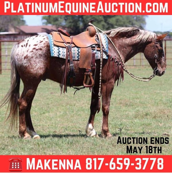 ONLINE AUCTION Place your bids at www.PlatinumEquineAuction.com Starting Bid $3500 Auction ends May 18th, 2025 Need a new saddle? Check out White Rock Saddles on our website or Facebook! WOW is all we have to say about this stunning gelding we call Maverick! He stands 15hh tall, just 8 years old! If you are looking for your next family member, look no more. He is the ultimate trail horse, and absolutely nothing phases this gelding on the trail! Mav crosses over anything in his path and loves water like a fish, he just marches right in! In the arena, Mav is simply outstanding. He has the smoothest gaits and the smoothest transitions! Lopes right out of his tracks both directions and has a good stop. He has been rode both western and English. This guy would turn some heads in a show ring! He’s been around cattle, doesn’t mind wildlife around him, doesn’t mind dogs, loud noises, four wheelers and such! He is traffic safe! You really can not go wrong with Maverick, he’s simply just cool. Maverick will sell sound, sane and with lifetime of memories! Please watch his video below to see just how cool he is! If he sounds too good to be true, come see him for yourself! We are located in Lipan Texas, but can also arrange shipping with a reputable hauler anywhere in the US, Hawaii or Canada. Please call or text Makenna hartzel 817-659-3778 for serious inquiries! ONLINE AUCTION Place your bids at www.PlatinumEquineAuction.com Starting Bid $3500 Auction ends May 18th, 2025 Need a new saddle? Check out White Rock Saddles on our website or Facebook!