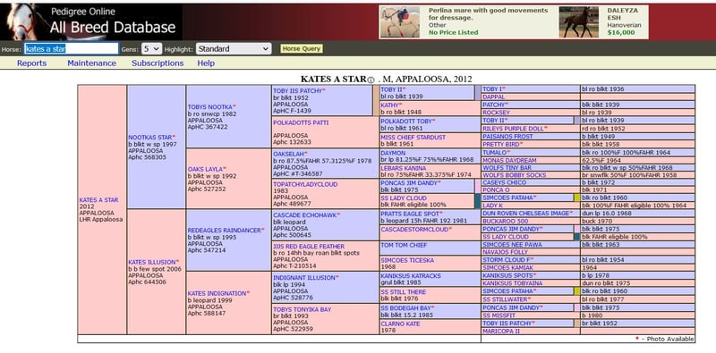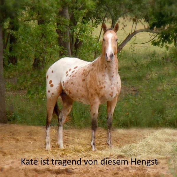 Kates a Star, zwana Kati, jest potomkiem "Toby 1", pochodzi więc z słynnej linii Toby. Była jeżdżona w czasie, gdy nie była w ciąży i nie miała źrebaka przy sobie. Kate jest doskonałą matką i teraz znów jest w ciąży z Buns Final Chief. Jej ostatni źrebak (zobacz zdjęcia) jest buckskin; wcześniej miała źrebaka w kolorze szabrakentiger, a jeszcze wcześniej źrebaka w kolorze tigerschecke. Przekazuje więc - w zależności od ogiera - kolorowe potomstwo. Ma bardzo dobre kopyta, jest spokojna podczas podkuwania i załadunku, a także bardzo miła w obcowaniu. Z doświadczeń w pracy z ziemi z nią można powiedzieć, że jest mądra, szybko się uczy i jest współpracująca. Muszę się z nią rozstać ze względu na wiek i zdrowie i oddam ją tylko w dobre ręce. Kate nie miała żadnych problemów w czasie, gdy była u mnie; to dotyczy również porodu i jej źrebaków (chętnie rozmowa telefoniczna z jej weterynarzem).