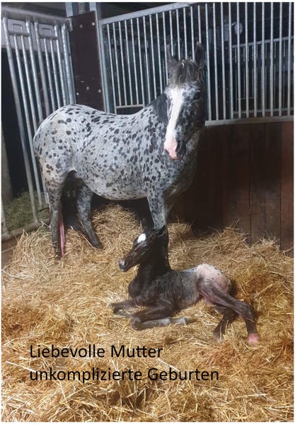 Kates a Star, conocida como Kati, es descendiente de "Toby 1", por lo que proviene de la famosa línea Toby. Durante el tiempo en que no estuvo en estado de gestación y no tuvo un potro a su lado, siempre fue montada. Kate es una madre excelente y ahora está nuevamente preñada de Buns Final Chief. Su último potro (ver imágenes) es un buckskin; antes de eso, tuvo un schabrackentiger y antes de eso un tigerschecke. Por lo tanto, transmite - dependiendo del semental - colorido. Tiene cascos muy buenos, es tranquila para el herrador y para cargar, y es muy agradable en el trato. A partir de las experiencias en el trabajo en el suelo con ella, se puede decir que es inteligente, aprende rápido y es cooperativa. Debo separarme de ella por motivos de edad y salud, y solo la entregaré a un buen lugar. Kate nunca ha tenido problemas desde que está conmigo; esto también se aplica al parto y a sus potros (con gusto puedo facilitar un contacto con su veterinario).