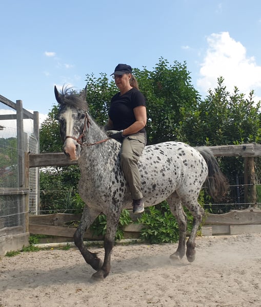 Kates a Star, surnommée Kati, est une descendante de "Toby 1", provenant donc de la célèbre lignée Toby. Elle a été montée pendant la période où elle n'était pas pleine et n'avait pas de poulain à ses côtés. Kate est une excellente mère et est à nouveau pleine de Buns Final Chief. Son dernier poulain (voir les photos) est un Buckskin ; avant cela, elle a eu un Schabrackentiger et encore avant, un Tigerschecke. Elle transmet donc - selon le cheval de reproduction - des couleurs variées. Elle a des pieds très sains, est ferrée et chargée sans problème, et est très agréable à manipuler. D'après mon expérience en travail au sol avec elle, je peux dire qu'elle est intelligente, apprend rapidement et est coopérative. Je dois me séparer d'elle pour des raisons d'âge et de santé et je ne la confierai qu'à un bon endroit. Kate n'a jamais eu de problèmes depuis qu'elle est avec moi ; cela s'applique également à son poulinage et à ses poulains (je peux fournir un contact avec son vétérinaire).