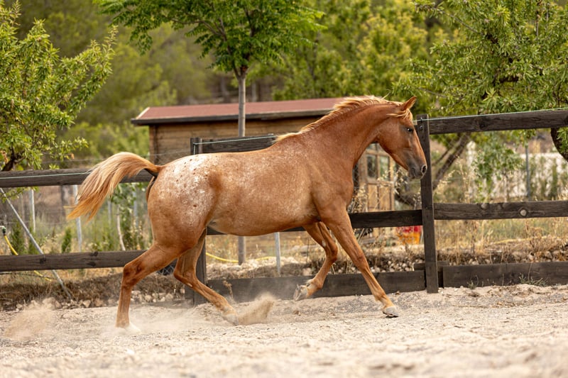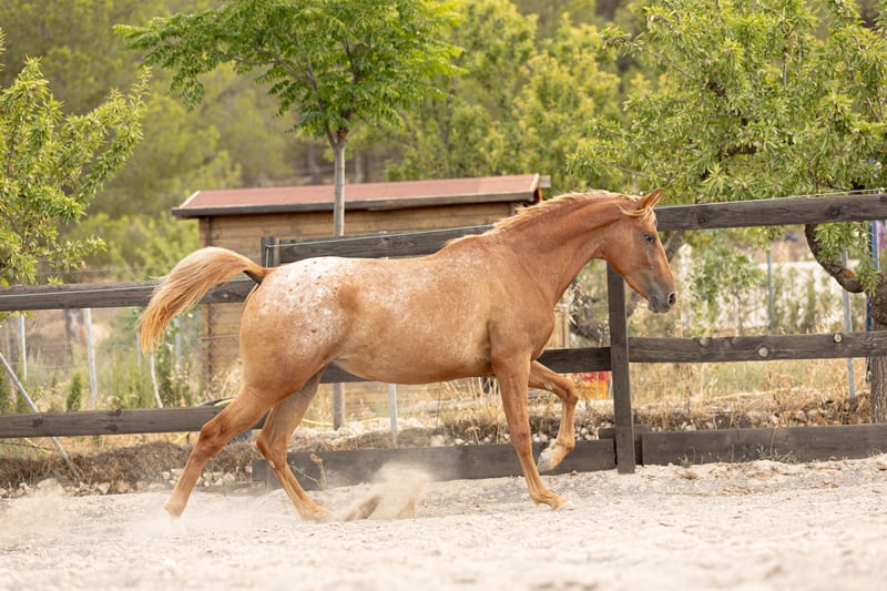 ✨ ARIZONA – Young filly with a golden soul and a heart of gold ✨ Meet ARIZONA, a young filly born in March 2023, a cross between Appaloosa, KWPN, and Spanish bloodlines. She has a Spanish passport and is eligible for auxiliary registration with ANCADES (CDE -Spanish Sport Horse Registry). Arizona stands out for her deeply human-oriented character. She is incredibly affectionate, curious, and close to people. She always wants to be near, to participate, to be involved. She just loves attention and thrives on human connection. She is gently beginning her exploration of the world. She knows the basics: • Comfortable with brushing and showers • Picks up her feet well • Excellent with the equine podiatrist (visits every 6 weeks) • Dewormed and vaccinated • Ties calmly • Has started basic lungeing • Goes on lead rope walks in the forest Like all our horses, Arizona is raised in an environment that prioritizes respect, trust, and emotional well-being. Our ethical training starts from the ground up, focusing on creating a real bond between horse and human. Natural and complete diet: • Hay available 24/7 • Alfalfa • Alpine herb cobs • Mash • Mixed grain flakes Her golden-red coat and blonde mane give her a striking appearance, but what truly captivates is her expression, her closeness, and her joy in sharing space with humans. Arizona is ideal for someone looking to start a beautiful story from the beginning – with patience, love, and the desire to build a deep, lasting connection. Want to meet her? Contact us via phone or WhatsApp for more information, photos, or videos.