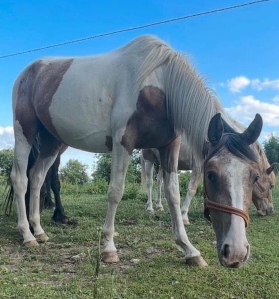 Kenda is a broodmare with striking coloring and very promising potential, appealing to both enthusiasts of unique coat patterns and those interested in breeding. - Red Roan Tobiano (Appaloosa cross) - in foal (by an Appaloosa stallion) - unbroken - curious - sensitive - requires gentle and calm handling - builds trust when given time - being sold pregnant - foal with Appaloosa lineage expected Highly suitable for: breeding or leisure with future prospects The sale is due to age and part of a reduction of a long-established horse herd. This is explicitly not a distressed sale.