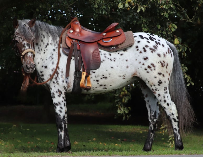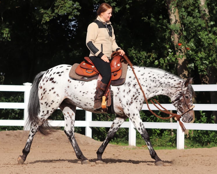 With Pixie, dreams come true! Pixie is looking for a loving forever home. She is a very loyal mare with a friendly and relaxed nature. She learns quickly, is curious, cool, and confident. She has always gotten along well with other horses in the herd. Pixie is an absolutely charming Appaloosa mare in stunningly beautiful color, who should only be placed in caring hands. She is a sunshine at heart, giving a lot of trust, but can also be playful and is always up for an adventure. She enjoys work but also loves to be groomed and pampered. She enjoys the attention of her caregivers and is already accustomed to leisurely rides through forests and meadows. Especially on sunny days, she delights in water and loves to splash around. Due to her good-natured character and clear mind, she has already shown herself to be very reliable and manageable despite her young age. Pixie is perfect for Western or leisure riders, trail riders, and generally for those returning to horseback riding. With a height of approximately 1.53m, she has shown herself to be curious, calm, and unflappable towards everyday noises such as tractors or machines on the farm. She is an open-minded young horse that always wants to learn new things. Pixie is barefoot and has been doing well without shoes so far. Pixie is already accustomed to free work as part of Natural Horsemanship. With her calm and attentive nature, she has quickly learned the basics of free work. Following freely or making targeted hand changes to her person are easy tasks for Pixie. We want to find a new home for Pixie where she feels comfortable, continues to be challenged and supported, and receives the love she deserves. Therefore, she will only be placed in good hands and will be personally brought to her new stable for a fuel fee. If desired, a pre-purchase examination can be organized. We can be reached by phone at 01624348386 – no emails, please. ⸻ We are happy to take our time for trial riding and getting to know each other so that everything can take place calmly and in detail. To ensure that only serious buyers express interest, we request a small contribution of €50, which will of course be credited towards the purchase of the horse. Thank you for your understanding!