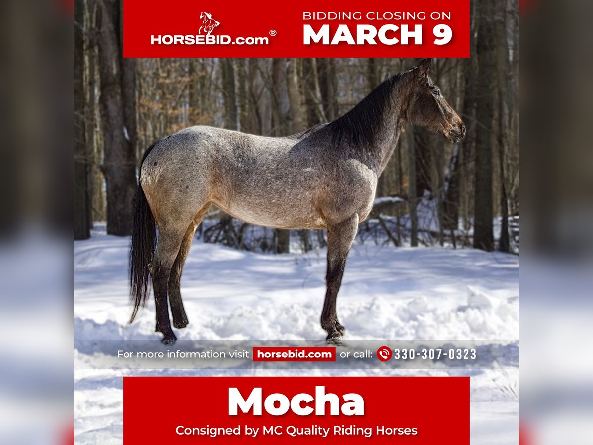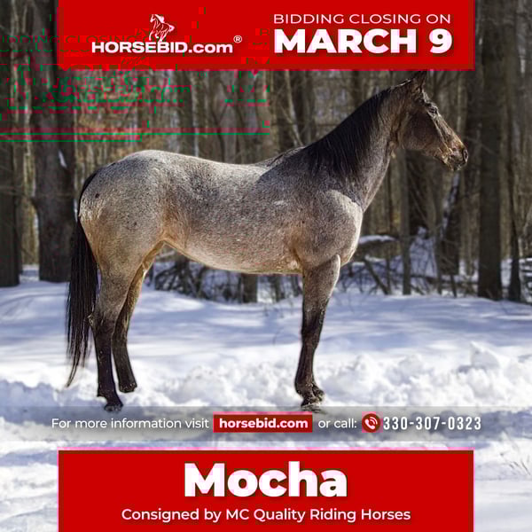 ℳ𝒶𝓇𝒸𝒽 ♦️𝐑𝐈𝐃𝐄𝐑'𝐒 𝐂𝐇𝐎𝐈𝐂𝐄♦️ Happening now thru MONDAY | MARCH 9th - Available EXCLUSIVELY on HorseBid's website! For more details and to register visit: www.Horsebid.com CONSIGNOR CONTACT: MC Quality Riding Horses 330-307-0323 LOCATION: North Bloomfield, OH BREED: Appaloosa REGISTERED: No REGISTERED NAME: Mocha COLOR: Bay Roan HEIGHT: 14.2 AGE: 8 GENDER: Mare Mocha is an 8-year-old grade Appaloosa mare standing 14.2 hands. She’s confident, seasoned, and takes care of her rider every step of the way. Mocha is a true point and go horse with zero spook. She’s been ridden straight from the house, through town, around traffic and farm equipment, and even to the lake where she absolutely loves the water. She has also been used to gather cattle out in Nebraska and has proven to be calm, reliable, and handy in real world working situations. She loves arena work and is incredibly smooth to ride. Mocha picks up both leads effortlessly, has a very soft mouth, and is extremely responsive to cues. She moves along at a comfortable, medium-soft pace that you can ride for hours. Mocha has been ridden English and Western and has been started over cross rails with zero hesitation. She will go wherever she’s pointed. She’s confident, and willing. Mocha loves to have a job. This mare is an absolute sweetheart and loves kids. She’s kind, patient, and safe, making her suitable for any level of rider, from beginners to more experienced riders wanting a trustworthy partner. On the ground, she’s easy to handle, stands quietly for grooming and tacking, and is a pleasure to be around. Mocha has been exposed to cows, farm animals, traffic, noise, and new environments, making her an excellent choice for a family horse, trail rider, arena rider, trail obstacle, or lower-level English prospect. She is barefoot, an extremely easy keeper, and 100% sound - the kind you can enjoy without extra maintenance or surprises. Shipping can be arranged anywhere in the U.S. Please do not hesitate to reach out to McKenzie with any questions!