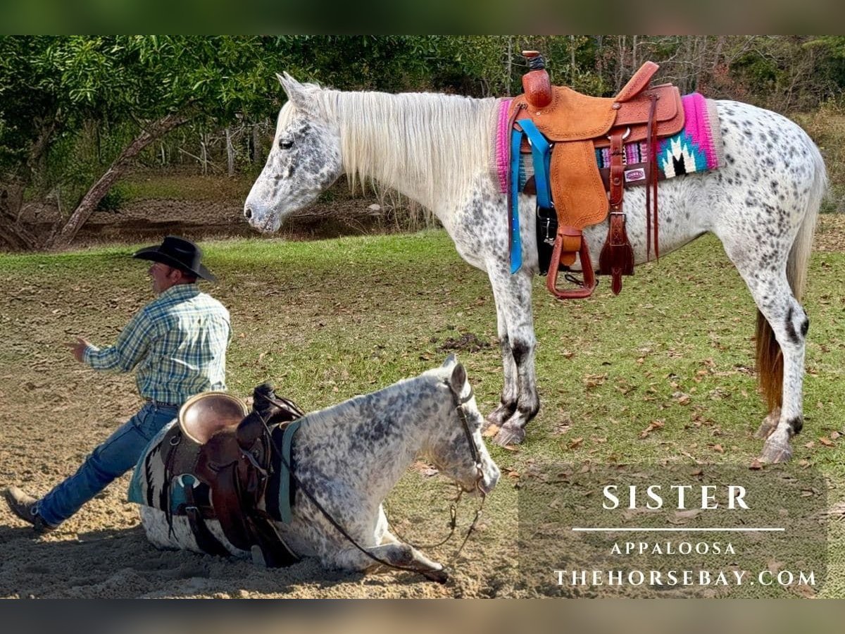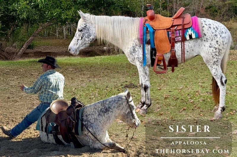 Sister is a 8 year old Appoloosa mare. She stands 13.3 hands tall. Sister is a cool little horse to ride. She does amazing on trails in the woods or on the highway. She will ride in the front, the middle, or the back of the trail ride. She is ok with that. She’s just glad to be there; she has no problem crossing water, bridges, or logs, and isn’t afraid of wildlife such as hogs, turkeys, and deer, which sister has been hunted off of for over two years now. Sister has a great one-hand neck rein; she will walk, trot, and lope both ways. She catches her leads easily. She has a good stop and backs up without issue. Sister has been shot off of a lot when she was hunted off of. I have been using her as a practice horse for the cowboy mounted shooting competition. She is a good little shooting horse and will run right down the middle and stay true and not duck or veer off on the run down. Sister has been pulling the cart for over a month now. She will start and stop the cart with ease. She sure is a pretty buggy-driving horse. Sister has also been introduced to trick training! She successfully completed my course of lay down on command. She goes down very easily. She loads all types of trailers easily. She’s easy to wash, saddle, harness, and bridle. She will stand well for mounting and dismounting. I have roped the breakaway dummy off of her a few times with no problem. She is clean-legged, with no scars or health issues. She is a clean little mare. If you’re looking for a pretty, pretty little mare, check out Sister.