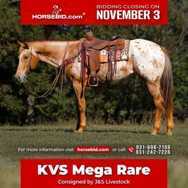 ⚜️𝐓𝐇𝐄 𝐅𝐀𝐋𝐋 𝐇𝐄𝐑𝐈𝐓𝐀𝐆𝐄 𝐂𝐋𝐀𝐒𝐒𝐈𝐂⚜️ Happening now thru MONDAY | NOVEMBER 3rd - Available EXCLUSIVELY on HorseBid's website! For more details and to register visit: www.Horsebid.com CONSIGNOR CONTACT: J&S Livestock J.T. 931-698-7159 or Bailey 931-242-7226 LOCATION: Santa Fe, TN BREED: Appaloosa REGISTERED: Yes REGISTERED NAME: KVS Mega Rare COLOR: App HEIGHT: 15.1 AGE: 8 GENDER: Mare “KVS Mega Rare” AKA Moonpie is a 2017 model registered app mare standing 15.1 hands, and is as beautiful as one could ask for and built correctly- great bone structure and disposition. This is the true definition of a gentle, versatile mare almost anyone can get along with and enjoy. Moonpie has been clocking in the 2d, and progresses each run. This mare will give you her all each and every time and wants to always be better. She has so much potential to be clocking in the 1d with consistent runs. She also knows poles as well. Moonpie would be an excellent candidate for anyone looking for a kid a good step-up horse to go out and rodeo on. She’s easy to handle- she does good stalled or turned out on pasture, she’s easy to bathe and stands quietly at all cost. She stands to be mounted good and trailers perfectly. Moonpie also makes a pretty good trail horse to just go out on and relax- we have had her on multiple trail rides and she’s always done fantastic. She won’t spook and will stay level headed out on the trails for her rider. This mare has a really soft handle to her and moves off leg pressure nicely. This is such a great mare that has nothing but want to & try, she aims to please you. She has no health issues or bad habits, and has a clean, recent PPE. For any further information on Moonpie please down hesitate to call or text! Bailey 931-242-7226 or JT 931-698-7159