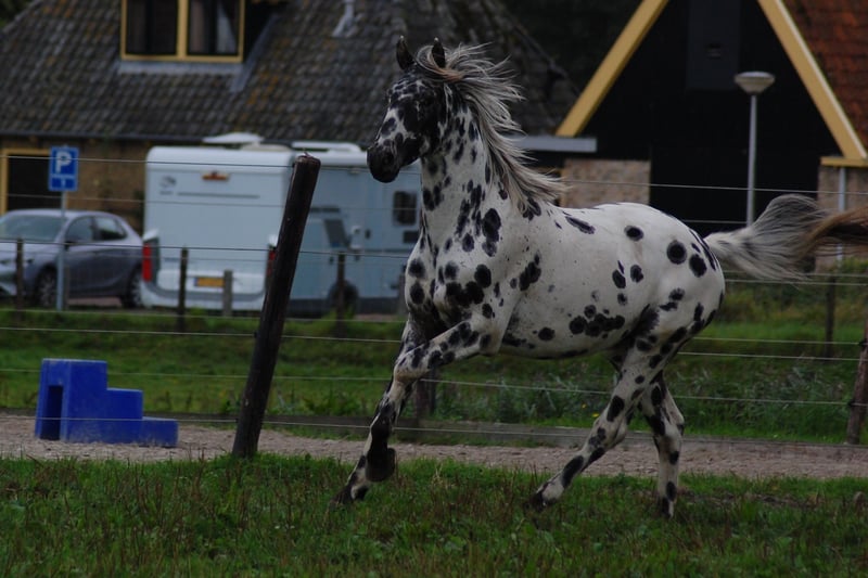 Ce cheval est le fer de lance du spectacle grâce à son allure et à son grand mouvement. Il est issu des meilleures lignées néerlandaises d'Appaloosa : Père Dutch 1st Premium Champion Peru's First Class (avec beaucoup de sang KWPN, comme Krack C et Jazz) Mère Star Mare, vice-championne Père de la mère Palousa Convenance, 5 fois championne des Pays-Bas (son père est Gibraldi, le grand étalon noir de Grand Prix qui a participé à la finale de la Coupe du monde avec Edward Gall à Las Vegas). Karakter très doux et affectueux, un peu timide. Il peut être tenu en licol, mais il est encore vert à l'entraînement. Il est toujours gardé dans un groupe de jeunes étalons, avec des gens autour. Beaucoup de liberté de mouvement dans le champ. Il cherche maintenant un nouveau propriétaire qui aimerait travailler avec lui. Bien que sa mère ait été élevée pour le dressage, elle aime aussi le saut d'obstacles, et je m'attends donc à ce que ce cheval puisse être utilisé de manière polyvalente. C'est un cheval de concours, il est très à l'aise devant la caméra et fait le spectacle avec son allure impressionnante.