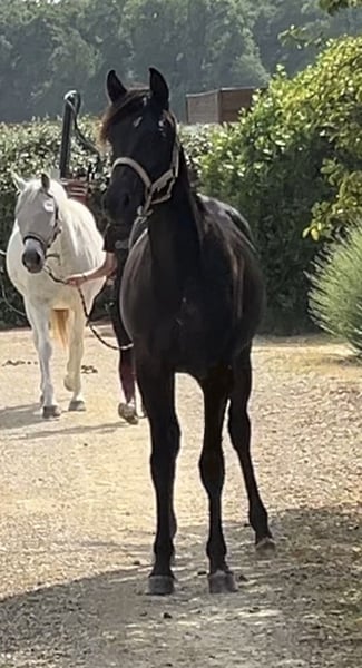 Born at the end of April 2024, Hadj is elegant, intelligent, and very bonded. Curious and very close to humans, he loves being taken care of. The dynamics and lightness of his gaits, as well as his balanced character, are assets for a versatile sport or leisure horse. Hadj's ancestral origins (old bloodlines) may also qualify him for breeding. His growth suggests an adult height of over 1.55 m. Like all foals, Hadj is handled, vaccinated, dewormed, and supplemented. He is raised in a group and was weaned late (11 months). His price evolves with age and the progress of training. Several other horses are available for sale at the breeding farm; please consult the website and contact me via SMS for more information, including HADJ DU GREMILLON, a 2024 black male Purebred Arabian foal. Like all foals, Hadj is handled, vaccinated, dewormed, and supplemented. He is raised in a group and was weaned late (11 months). His price evolves with age and the progress of training. Several other horses are available for sale at the Haras du Gremillon; please consult the website and contact me via SMS.