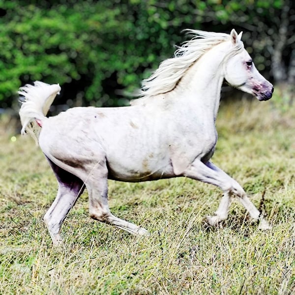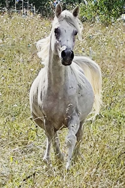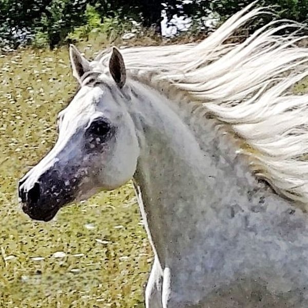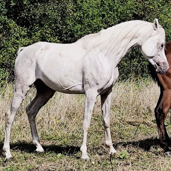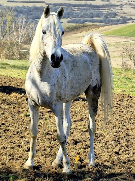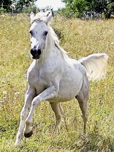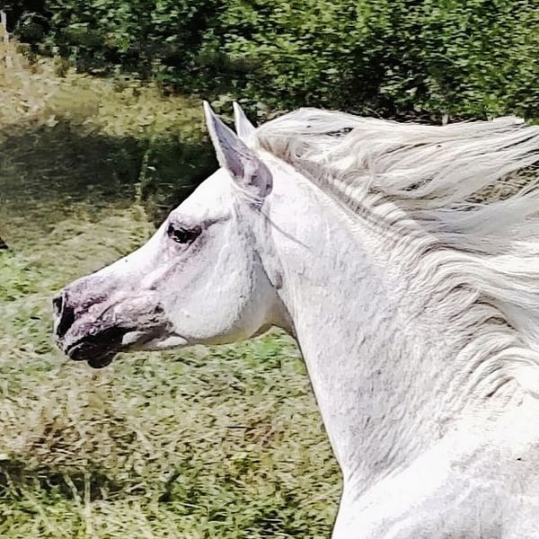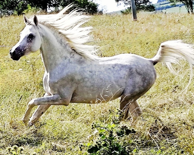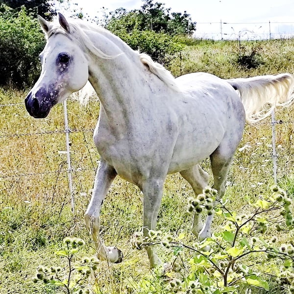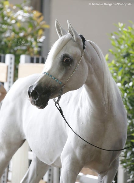 - Typical, charismatic Asil Arabian stallion for breeding, sport and leisure - ASIL ARABER (straight egyptian) - M-line: SG (Saklawi Gidrani) - very best pedigree: (ANSATA AMIR ZAMAN, AUTHENTIC IBN NAWAAL (premium), MESSAOUD elite stallion, MAYSOUN elite stallion, MADKOUR, MORAFIC) - Large eyes - very much expression in the face - highly intelligent, very attentive and docile - very present (knows how to put himself in the limelight) - long shoulder - high set, long, curved neck with high erection - super correct foundation (square type) - long croup - strong joints and good hooves - Super GGA (very good walk) - Very people-oriented and affectionate - greets his fellow human beings from afar - super sociable, you can do everything with him - strong nerves (a rock in the surf!) - easy to forge and load - a horse with an extraordinary character - the last 3 photos show his beautiful mother AL CHADIM GAZIA Sales price: VHB 9.000,- Euro -