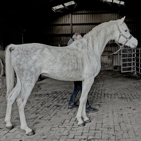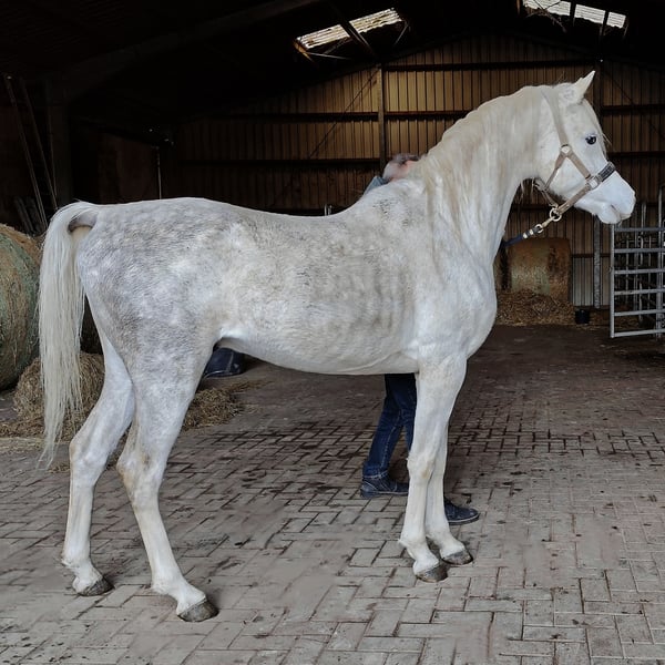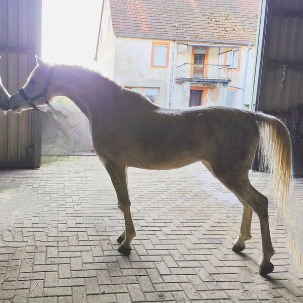 - Typical, charismatic Asil Arabian stallion for breeding, sport and leisure - ASIL ARABER (straight egyptian) - M-line: SG (Saklawi Gidrani) - very best pedigree: (ANSATA AMIR ZAMAN, AUTHENTIC IBN NAWAAL (premium), MESSAOUD elite stallion, MAYSOUN elite stallion, MADKOUR, MORAFIC) - Large eyes - very much expression in the face - highly intelligent, very attentive and docile - very present (knows how to put himself in the limelight) - long shoulder - high set, long, curved neck with high erection - super correct foundation (square type) - long croup - strong joints and good hooves - Super GGA (very good walk) - Very people-oriented and affectionate - greets his fellow human beings from afar - super sociable, you can do everything with him - strong nerves (a rock in the surf!) - easy to forge and load - a horse with an extraordinary character - the last 3 photos show his beautiful mother AL CHADIM GAZIA Sales price: VHB 9.000,- Euro -