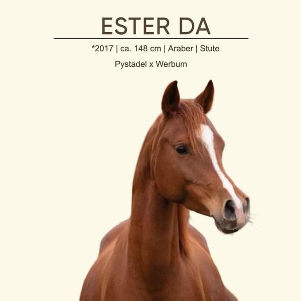 Bildschöne Araber-Tochter des Psytadel aus einer Werbum Mutter sucht ein neues, liebevolles Zuhause! ESTER weiß besonders durch ihre außergewöhnliche Schönheit und ihrem freundlichen, menschenbezogenen Charakter zu überzeugen. Bereits unter dem Sattel im Parcours vorgestellt, zeigte sie sich dabei stets aufmerksam, brav und leistungsbereit. Als gehfreudiges Pferd mit Eigeninitiative richtet sie sich jedoch an erfahrene Reiterhände und ist nicht für Anfänger oder komplett unerfahrene Reiter geeignet. Im täglichen Umgang bereitet sie stets Freude und hinterlässt bei jedem Kontakt einen durchweg positiven Eindruck. ESTER ist ein ehrliches, angenehmes Pferd mit viel Charakter, Ausstrahlung und vielseitigem Potenzial. Ideal für Spezialrassen-LiebhaberInnen. Mit ihrem Papier auch sehr interessant für die Zucht!
