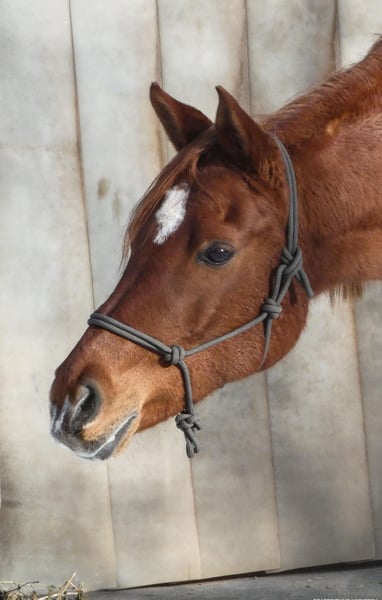 Shanna has an incurable injury in the sacroiliac joint. She shows no visible signs of pain but is very tense and highly mistrustful of strangers. Within the herd, she is very dominant. She enjoys lunging, groundwork, and even small obstacle exercises.