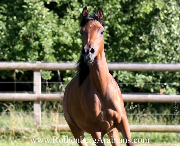 Exotic pretty bay Straight Egyptian yearling filly with black gene for sale! Father is our homebred black stallion GR Madhin (full-brother to our homebred black Champion-mares GR Marietta & GR Marianah; by our black Gold premium foundation stallion Madallan-Madheen), the mother is a daughter of our black Gold premium stallion Maheeb from the same motherline as our “Queen” GR Nashidah! Other exotic typey black, bay & grey Straight Egyptian foals, youngsters and breeding horses for breeding, show and sport for sale! Pearls from worldwide wellknown and successful breeding, famous and proven pedigrees and special people-loving characters! Detailed information, prices and conditions on request, please call at 0049 / 9091 / 3707 or send an e-mail including some information about you - thank you! More information to our breeding-horses and some sale-horses you find at our homepage www.RothenbergArabians.com, other sale-horses (also horses bred and owned by clients) on request! Please also visit us at instagram @RothenbergArabianStud