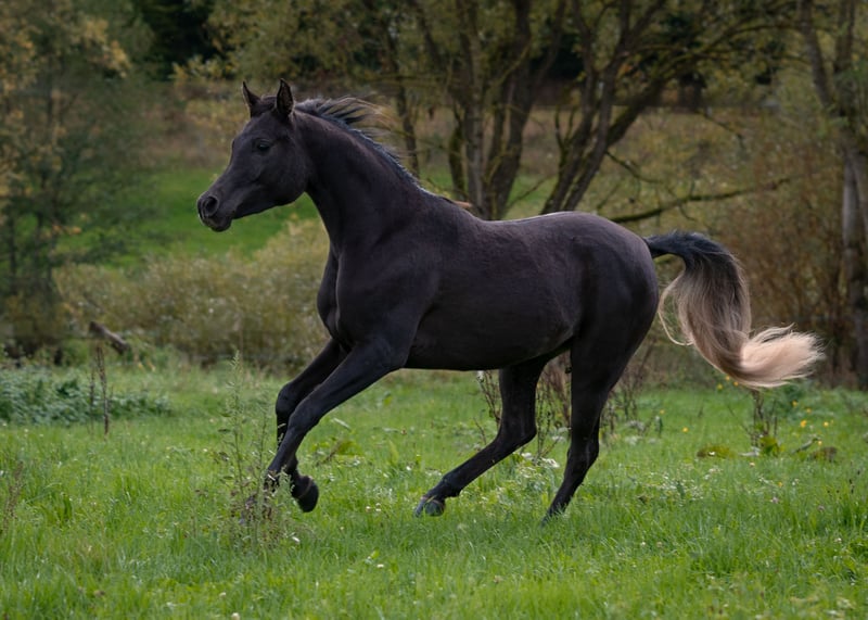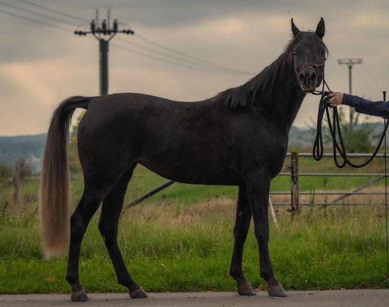 Aisha is a stunning, well-built, purebred black Egyptian Arabian mare with a sweet, human-oriented character and an intriguing pedigree that makes her highly interesting for breeding. She has correct conformation, solid foundations, a harmonious body, and a good topline. Her refined, typy, dry face features large, expressive dark eyes and a delicate muzzle. Her head flows smoothly into a refined neck and a well-shaped, elegant neck. Her strong body, with well-angulated shoulders and hips, and a good topline, stands on correct legs with very good hooves. A special color highlight is her silver tail hair, a genetic trait inherited through the maternal line (not Rabicano). Her movements are expansive, elastic, and lively, with three well-defined basic gaits. She is very calm and nerve-strong. Aisha has a gentle character, enjoys cuddling, and seeks to please. She is intelligent, quick to learn, and eager to pick up new things. Her interesting pedigree and homozygosity for the black gene make her especially appealing for Arabian breeding. She is free from the genetic defects CA, SCID, and LFS. All these qualities make Rania very promising as a future broodmare. She also shows great potential as a riding horse for endurance and demanding leisure riding. She will be a loyal companion you can rely on through thick and thin. Both her parents are good riding horses. Aisha is familiar with ground work, hoof care, trailer loading, children, cattle, cats, dogs, large machinery, traffic, etc.—in short, everything a young horse should know. She was raised in a herd and is very well socialized. Upon request, Aisha can be bred to one of my purebred Egyptian Arabian stallions, guaranteeing a black purebred Egyptian foal.