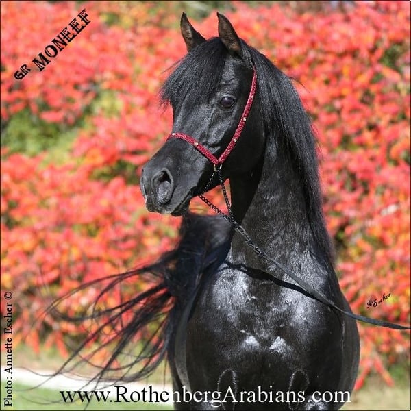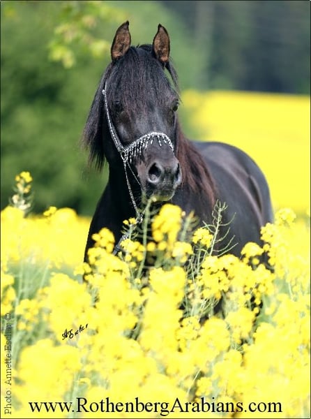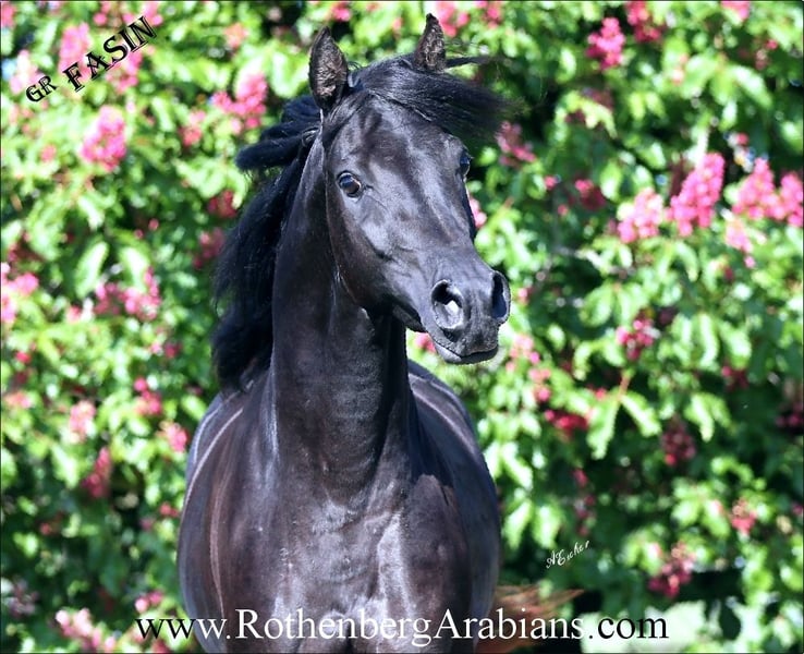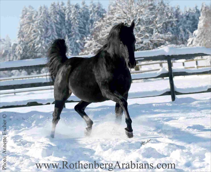 Homozygous black Straight Egyptian stallion without any white markings by black show-winner GR Faleeh (exp. Kuwait, by world-famous black gold premium stallion Madallan-Madheen)! Exotic classic in type, fantastic body, gorgeous and super showy movements and most important a just wonderful character! Offspring with breeders on 5 continents! From time to time shipped semen in best quality available, life-foal-guarantee (if not pregnant breeding for free the following year, change of stallion mostly possible upon request) From time to time shipped semen in best quality available, life-foal-guarantee (if not pregnant breeding for free the following year, change of stallion mostly possible upon request) 13 additional Straight Egyptian stallions - most of them black, several homozygous! Some of them standing outside for breeding, some have shipped fresh / frozen semen avaialble! World-famous stallions, several gold-premium stallions and/or winner of stallion-licensing / some big show-success / some with winning offspring worldwide! Black & grey, some homozygous! Are stallions are SCID & CA free, Breeding-fees from Euro 700,- up (depends the stallion and pedigree of the mare) - detailed breeding-conditions on request! Always offspring and breeding-stock available for purchase! Please visit us at Instagram: RothenbergArabianStud