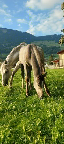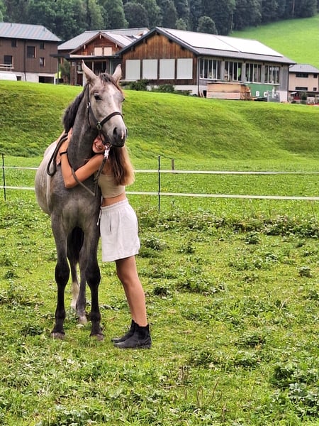 Herzlich willkommen! Kurze Info über mich. Ich bin im Reitstall bei meiner Familie in Vorarlberg aufgewachsen, 2007 habe ich die Landwirtschaftliche Fachschule in Hohenems mit dem Facharbeiter abgeschlossen. Mit 8 Jahren habe wir (ich und meine Schwester) unser eigenes Pony bekommen. 2019 habe ich mir den Wunsch vom eigenen kleinen Reitstall mit Reitplatz und Koppeln erfüllen können. Unsern Hof umfasst ein Wohnhaus mit 2 Ferien- Appartments. Wir bieten unseren Gästen Reitunterricht/ Ausritte an. Derzeit sind wir im Besitz von 4 Pferden. Zwei Haflingerpferde und 2 Warmblutpferde (Zucht) Meine Leidenschaft ist die Pferdezucht und die Teilnahme an Sportbewerben im Ländle. Wir haben zwei tolle Stuten mit sehr interessantem Pedigree und TOP Charakter! Wir legen großen Wert darauf, dass unsere Pferde "klar" sind, das heißt, von Amateur- Reitern im Gelände und auf dem Reitplatz mit Spaß und Leichtigkeit geritten werden können. Die Pferde werden regelmäßig von mir selbst ausgebildet und trainiert, damit dies möglich ist! Sehr stolz bin ich auf unseren Nachwuchs! Fürstin Pasquina Österreichisches Warmblut, geb. 2008, Stkm. 168cm (Duino x Donnerschwee x Fürst Heinrich) tragend für 2023 Österreichische Warmblutstute (Zivatar x Koppany x Burggraaf) Good Girl 2, geb. 2018, Schimmel, Stkm. 177cm, tragend von Fürst Romancier, wir derzeit von meiner Tochter (10 Jahre!) problemlos auf dem Reitplatz in allen drei Grundgangarten geritten.