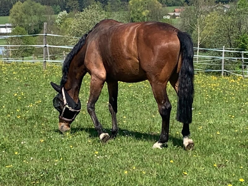 Zum Verkauf steht ein selbstgezogener, 8-jähriger Wallach mit einem Stockmaß von ca. 168 cm. Mit seiner Mutter war ich im Springsport erfolgreich, dementsprechend bringt er Talent und Freude am Springen mit. Er selbst verfügt jedoch noch über keine Turniererfahrung. Unter dem Reiter überzeugt er mit angenehmen, komfortablen Gängen. „I'm Johnny“ kennt sowohl Boxenhaltung mit Schrittmaschine als auch Offenstall und zeigt sich in beiden Haltungsformen unkompliziert. Hufschmied und Verladen sind für ihn selbstverständlich. Er ist regelmäßig geimpft und entwurmt. Knapp ein Jahr war er im Schulbetrieb im Einsatz und wurde dort auch von Kindern geritten, was seinen guten Charakter unterstreicht. Im Gelände ist er brav, geht alleine ausreiten sowie auch in Begleitung, sogar mit Hund. Aktuell ist er vorne beschlagen. Im Umgang zeigt er sich sehr sozial, verschmust und stark menschenbezogen. Für Johnny wird ein geduldiger, liebevoller und erfahrener Reiter gesucht, der ihm die nötige Zeit gibt, Vertrauen aufzubauen und ihm in manchen Situationen Sicherheit vermittelt. In einzelnen Momenten benötigt er etwas mehr Rückhalt durch seinen Reiter. Da er Ekzemer ist, wäre eine Haltung mit viel Bewegung und wenig Weide von Vorteil. Bei der richtigen Person ist der Preis Verhandlungsbasis. Probereiten nach Absprache gegen 30 €, um Reittourismus zu vermeiden. Bei ernsthaftem Kaufinteresse wird dieser Betrag selbstverständlich angerechnet.