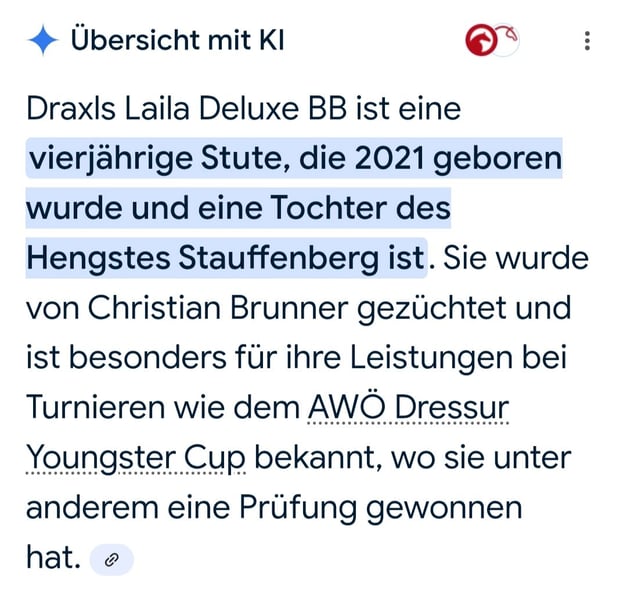 Nervenstarke, leichtrittige 4jährige Stute mit hervorragende GGA Reitpferdeprüfung 3 J. Res.Sieger mit 8.6 Reitpferdeprüfung 4 J. Siegerin mit 8.8 (Schritt 9,5 Galopp 9,0 Trapp 9,0) Bundeschampionat 4 J. 9te von 27 mit 8.0
