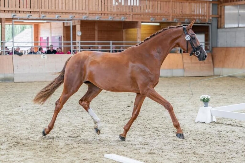 Mit Taimea W präsentiert sich eine außergewöhnlich typvolle und bewegungsstarke Nachwuchsstute des Jahrgangs 2022, die bereits in jungen Jahren mit Qualität, Ausstrahlung und Leistungsbereitschaft überzeugt. Diese elegante ÖWB-Stute vereint modernes Exterieur, korrekte Fundamentausprägung und drei überdurchschnittlich gute Grundgangarten – beste Voraussetzungen für eine erfolgreiche Zukunft im Dressursport. Besonders hervorzuheben ist ihr elastischer, schwungvoller Bewegungsablauf mit viel Takt, Losgelassenheit und natürlicher Bergauf-Tendenz. Ihr Schritt ist raumgreifend und taktsicher, der Trab überzeugt durch Ausdruck und Dynamik, und der Galopp zeigt sich bergauf gesprungen mit guter Balance. Dabei präsentiert sich Taimea W stets aufmerksam, lernwillig und mit einer positiven Einstellung zur Arbeit. Ihr ausgeglichenes Temperament sowie ihre Rittigkeit machen sie zu einem idealen Partner sowohl für ambitionierte Amateurreiter als auch für den professionellen Sport. Sie zeigt sich im täglichen Umgang unkompliziert, nervenstark und menschenbezogen – Eigenschaften, die sie zu einem besonders angenehmen Ausbildungspferd machen. Auch züchterisch und sportlich konnte Taimea W bereits früh auf sich aufmerksam machen: Siegerin der Stutbuchaufnahme 2025 der dreijährigen Stuten mit einer hervorragenden Wertnote von 8,16 Reservesiegerin beim Reitpferdechampionat mit einer beeindruckenden Wertnote von 8,40 Diese Erfolge unterstreichen eindrucksvoll ihr großes Potenzial und ihre Qualität. Taimea W ist ein Pferd mit Perspektive – ausgestattet mit allem, was man sich für eine erfolgreiche Zukunft im Dressursport wünscht: Qualität, Einstellung und Vermögen. Eine ideale Gelegenheit für Reiter, die ein talentiertes Nachwuchspferd mit besten Anlagen und Entwicklungsmöglichkeiten suchen.